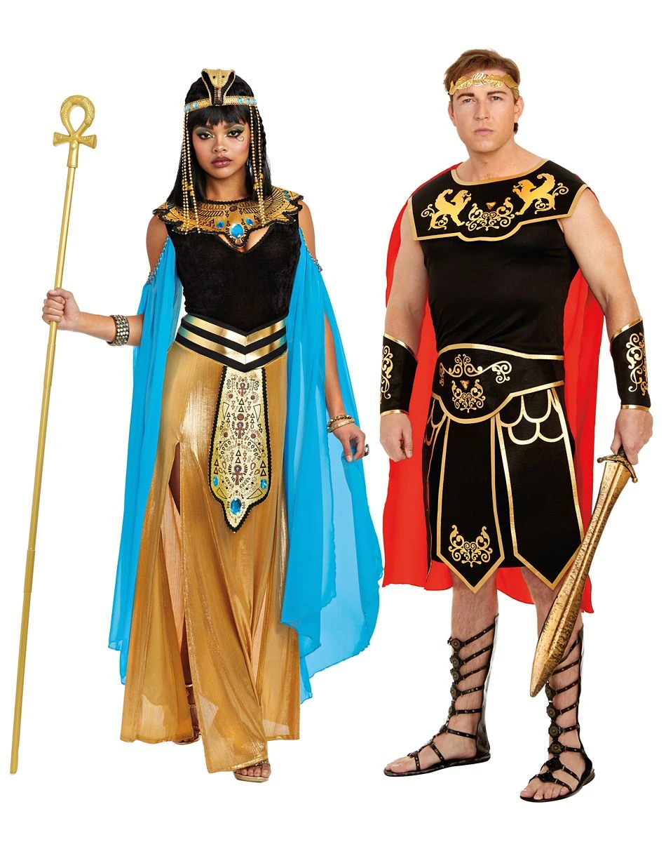 Flaunt your beauty and your power in this blue and gold Cleopatra costume! This stunning ensemble includes a long black and gold gown with attached sheer blue arm details. A side slit reveals a hint of leg, and an ornate collar adds a touch of luxe authenticity.
