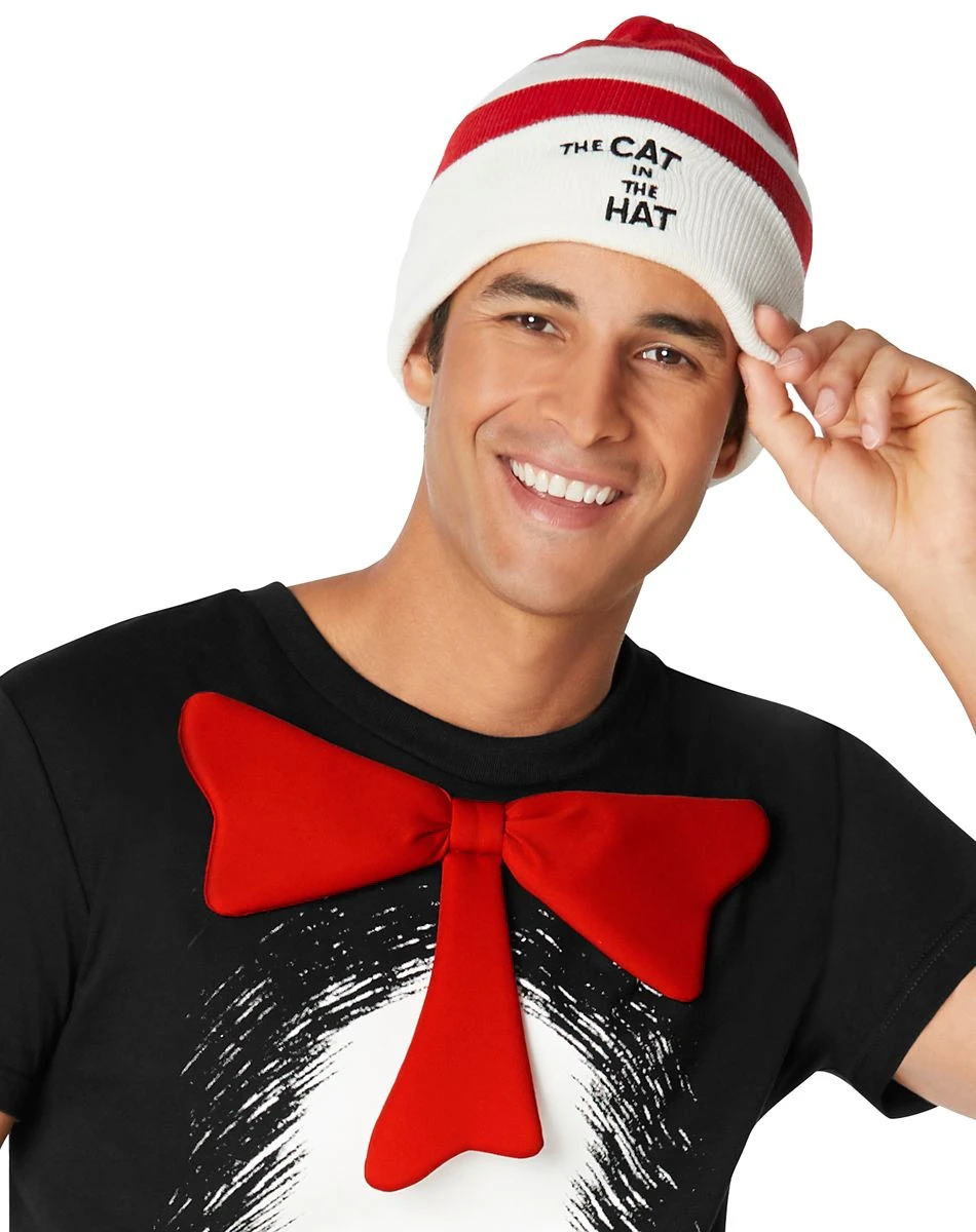 It’s all good times and rhymes in this officially licensed Adult Cat in the Hat Costume Kit! This cozy costume kit includes a black t shirt with printed white fur and an attached red bow. A red and white striped hat completes the storybook-inspired look!