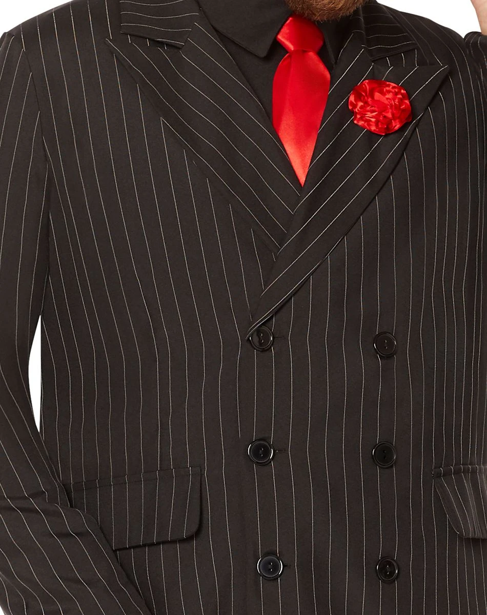 No one will mess with you when you rock this gangster costume! This pinstriped jacket and matching pants gives you a ’20s look that is unlike the rest. The included flower lapel pin matches the tie that is secured to the dickey for a put together look that will have your worst enemies shaking in their boots.