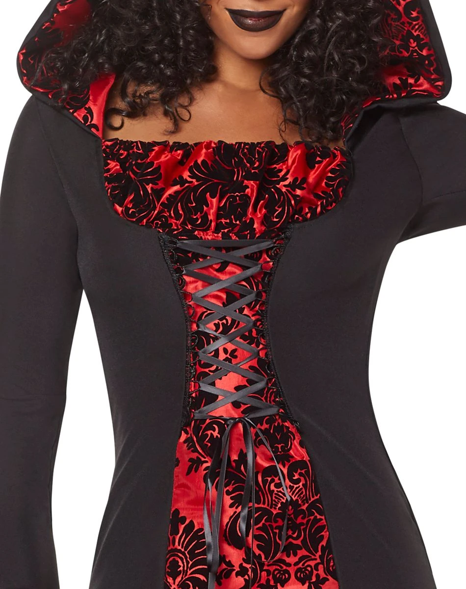 Sinister style never dies in this dark and classic Immortal Beauty look! The fierce red and black hooded dress is perfect for the finest in undead fashions. Velvet and satin insets elevate this undead delight into a look that is truly unforgettable.