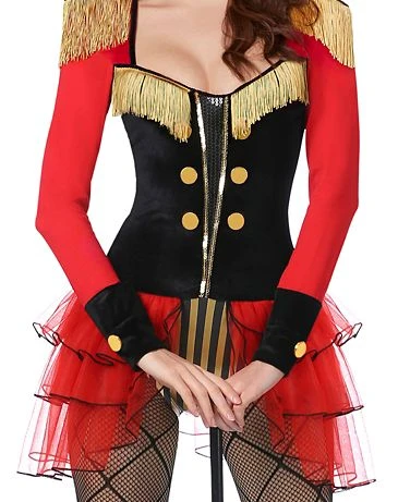 Have all eyes on you this Halloween at the costume party when you show up wearing this Mistress of Ceremonies Costume. While you’re wearing this costume that features a ringmaster bodysuit with fringe epaulettes, goldtone striped shorts, attached tutu layered skirt, sequin trim, goldtone button details, and a red striped top hat to complete the look, you’ll always be in charge of making sure the show goes on.
