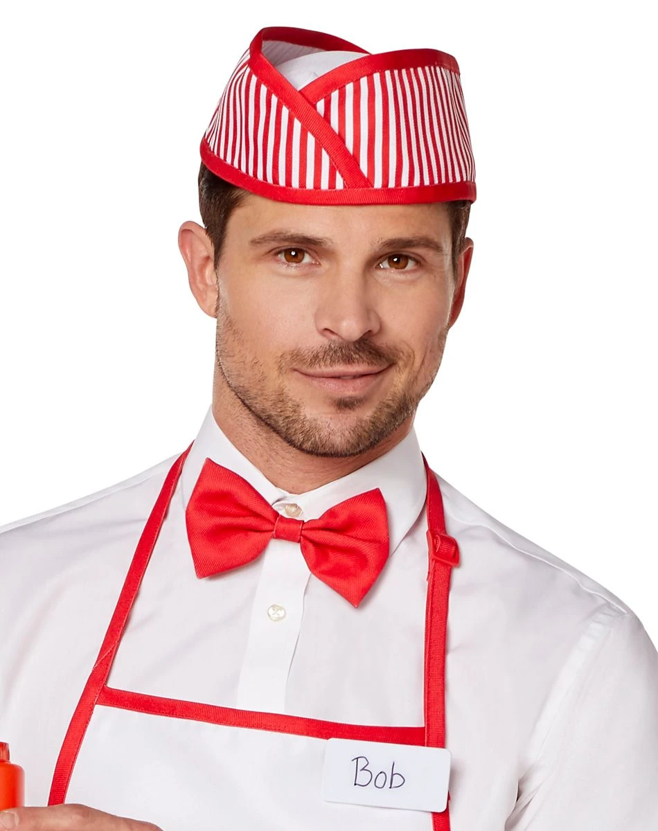 Order up! Throw it back to the ’50s with this diner guy costume. Coming complete with and apron, a bowtie, a hat, a nametag, an order book, and ketchup and mustard bottles, you’ll be ready to serve!
