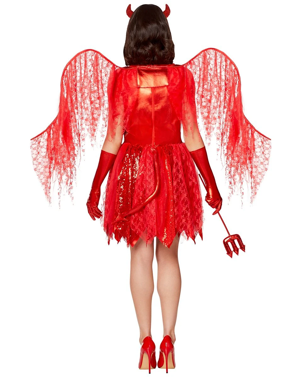Make it hot and light up the Halloween party with this Adult Miss Devil Costume! Keep the fire hot and enjoy a devilishly good time when you slip into the included dress, wings, gloves, tail, headband, and accessorize with the pitchfork!