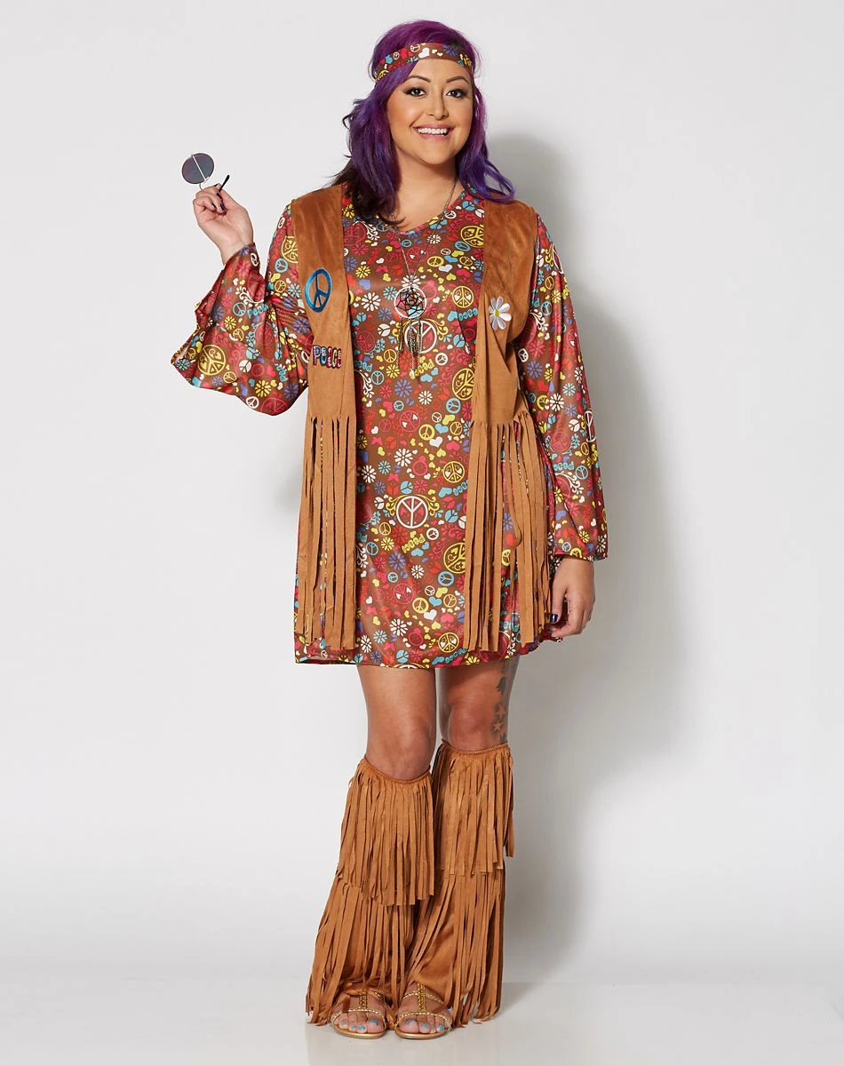 Let your carefree vibes shine through in the Peace and Love Hippie Adult Women’s Costume. You’re ready for any festival in this psychedelic printed dress with fringe vest, boot covers and printed headband.