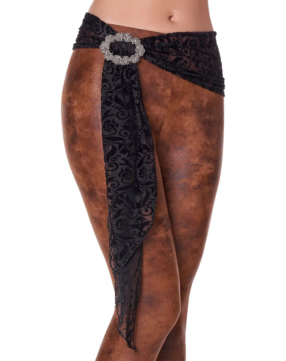 Perfect your pirate costume with these regal rebels pirate leggings! These faux leather leggings include a decorative sash that drapes around the hips. An ornate buckle adorns the sash, preparing you to sail the seas in style.