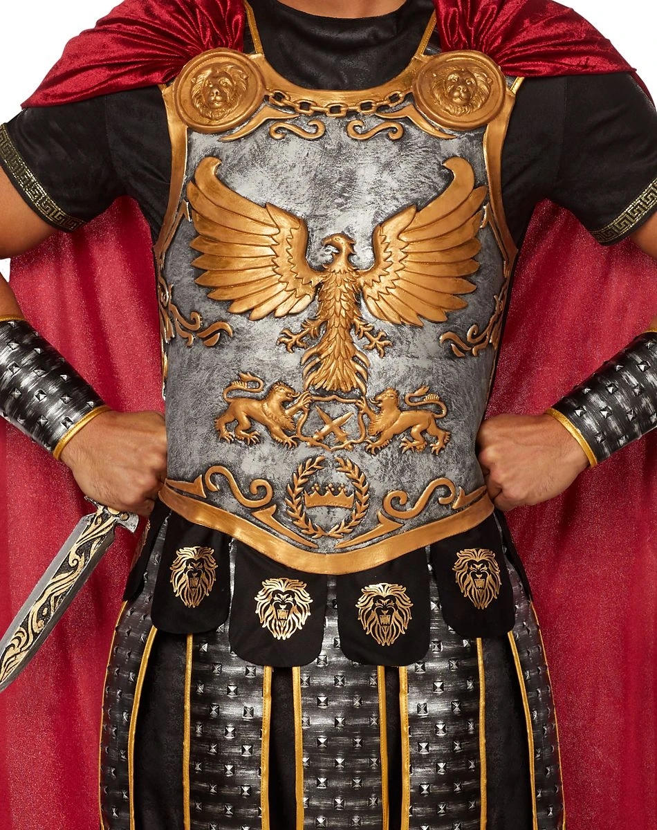 From our exclusive Signature Collection. You’ll be ready for any battle when you dress in this intricate Roman Emperor costume this Halloween. The included suede black tunic comes complete with Roman trim detail on the sleeves, making you look like royalty. Add the sculpted chest armor with attached cape and top off your look with the included arm gauntlets and shin gauntlets. The included Roman headpiece is the perfect finishing touch and will have you looking completely unbeatable on Halloween night.