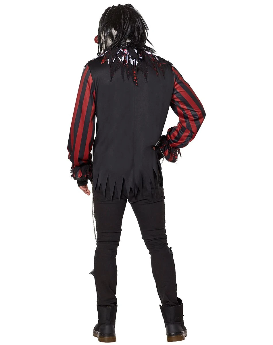 Who doesn’t love clowns? This Adult Scary Clown Costume Kit is bound to stir up more screams than laughter! This costume kit has all the classic features of a creepy clown: a striped, ruffle-neck shirt with fake bloodstains and a ragged hem, a pale white mask with full clown makeup, and stringy black hair. Have fun clownin’ around!