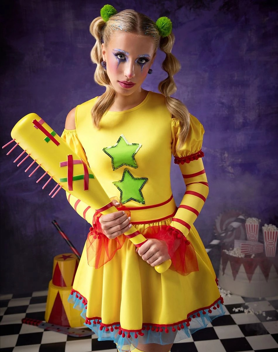 Get ready to clown around in this officially licensed Shorty dress costume! Featuring a yellow dress, over the knee socks, a blue collar, and pom pom hair accessories, this costume will transform you into the creepiest clown in the whole circus. If you love the movie Killer Klowns from Outer Space, this is the perfect costume for you!