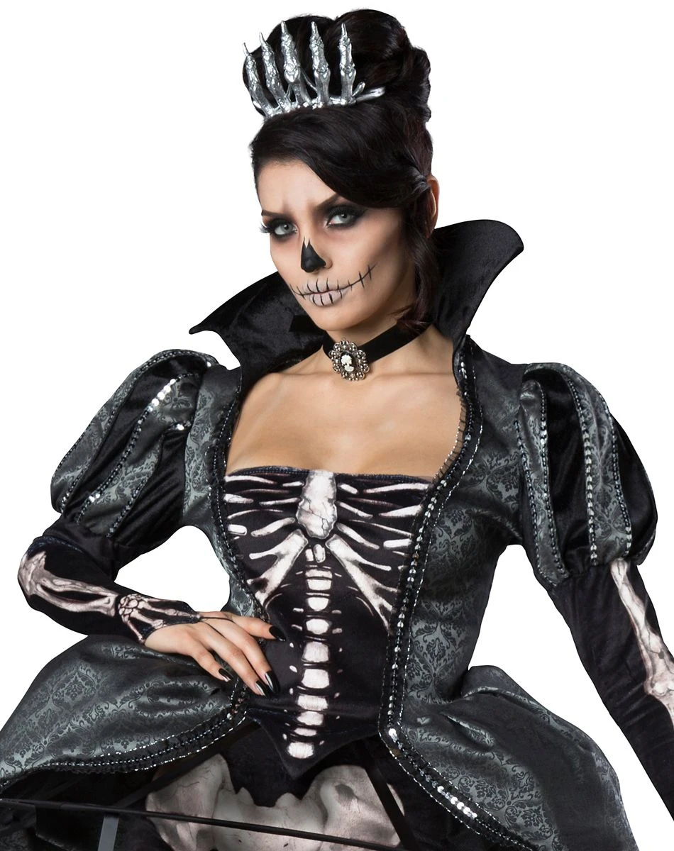 Become an elegant queen of the undead when you try on this adult skeleton queen costume this Halloween. This costume is fit for royalty and will have everyone bowing at their knees in your presence. Featuring a skeleton printed dress and leggings along with a skeleton crown and a black cage petticoat this costume will really make you look like the ruler of the skeleton kingdom. Reign supreme this Halloween when you wear this skeleton queen costume at your next party!