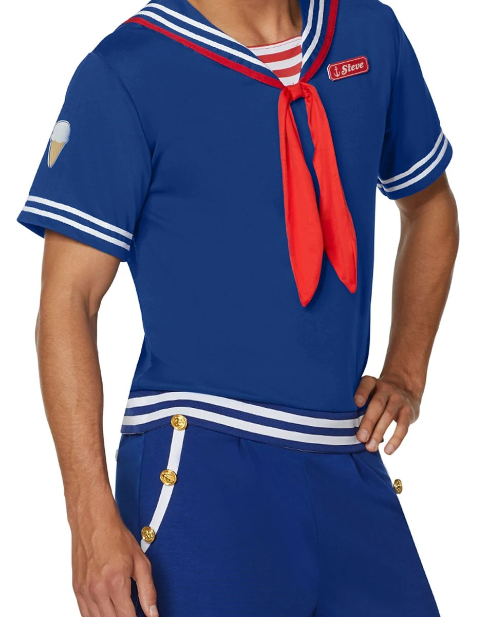 Ahoy! It’s time to grab some ice cream with this officially licensed Adult Steve Scoops Ahoy Costume, featuring embroidered patches to make this look your own. Get ready for a summer job with Steve Harrington in this uniform, a summer full of serving ice cream, sneaking Mike and his friends into the movies, and fighting life-threatening monsters. Sounds like a great summer, right..?