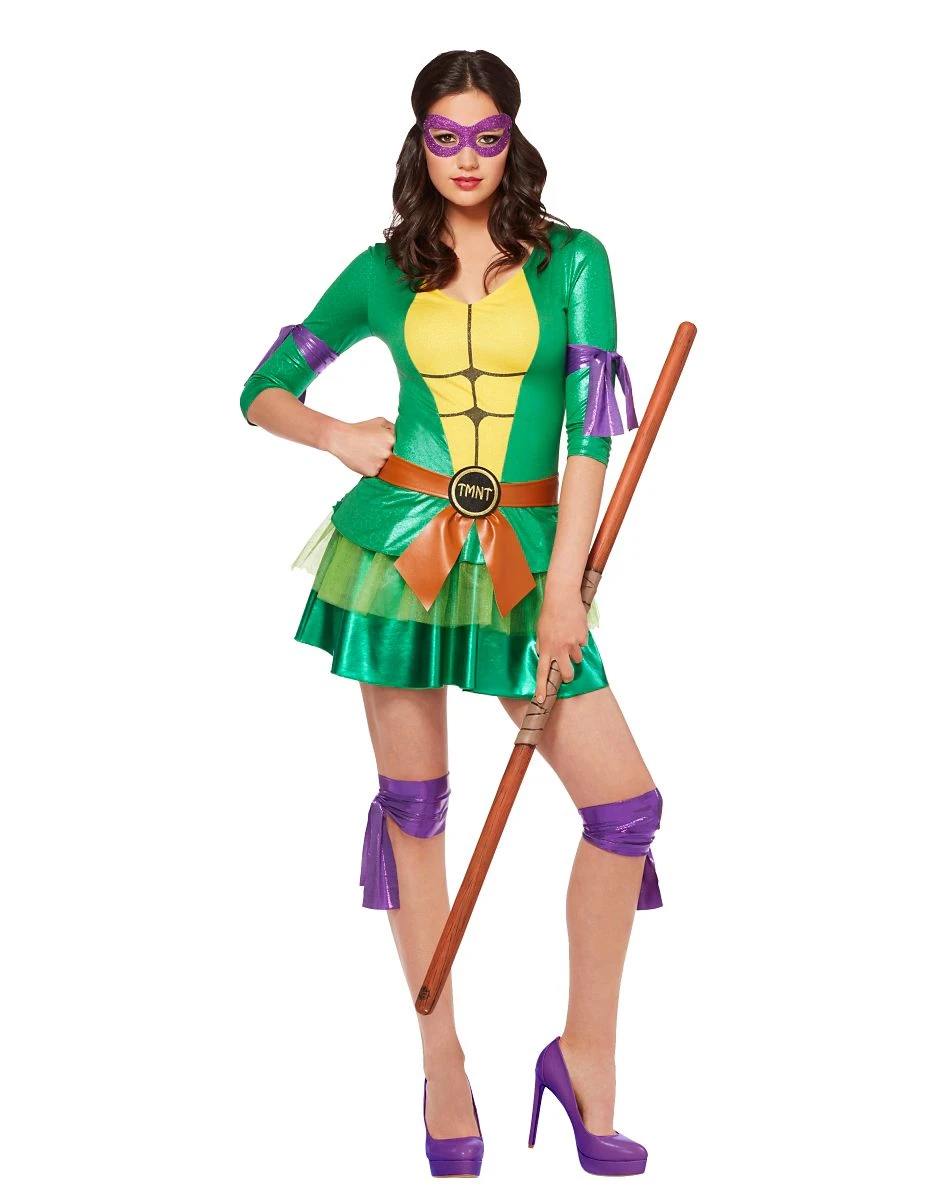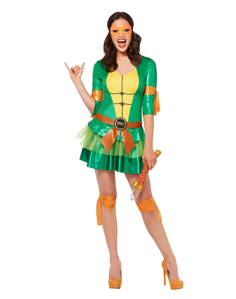 Glam and gutsy? You can’t go wrong in the cute crime-fitting officially licensed Teenage Mutant Ninja Turtles Dress Women’s Costume ! Transform into any of your favorite turtles with one of four jazzy eye masks in each Turtle’s color with coordinating metallic elbow ties. Shine among the New York City lights in this shimmery dress featuring ruffled skirt and glitter shell. Make the fight for candy official with pleather TMNT belt.