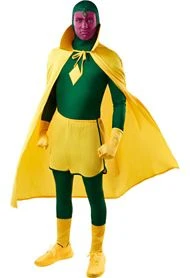 Dress like a synthezoid in this officially licensed Vision costume! Inspired by WandaVision, this gold and green ensemble is authentic down to the very last detail. This Vision costume includes a hooded green jumpsuit with built-in stirrups, an attached hood with a diamond-shaped appliqué, a long yellow cape, yellow shorts with green piping, and matching yellow gloves.