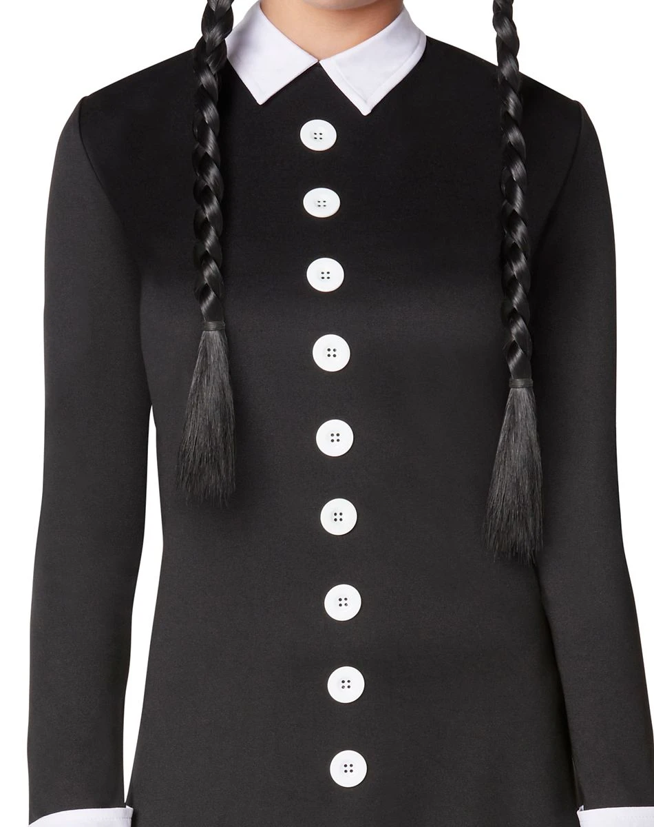 Wednesday’s child is full of woe! Transform into the sweet and spooky Wednesday Addams when you slip into this costume. Featuring a black dress with a white collar, white cuffs, and button details, you’ll feel like Wednesday Addams as soon as you put it on. Top off the look with black tights!