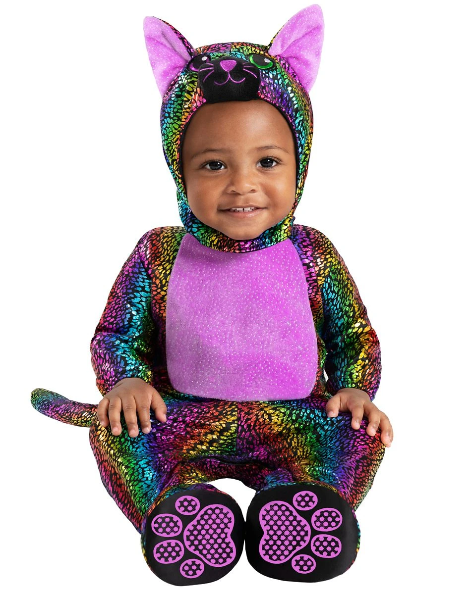 Your child will be colorful and cute purrrfection in this rainbow cat costume! Vivid rainbow spots and eye-catching purple accents cover this oh-so-soft jumpsuit from head to toe. Plus, built-in foot covers keep your little one warm all day long!
