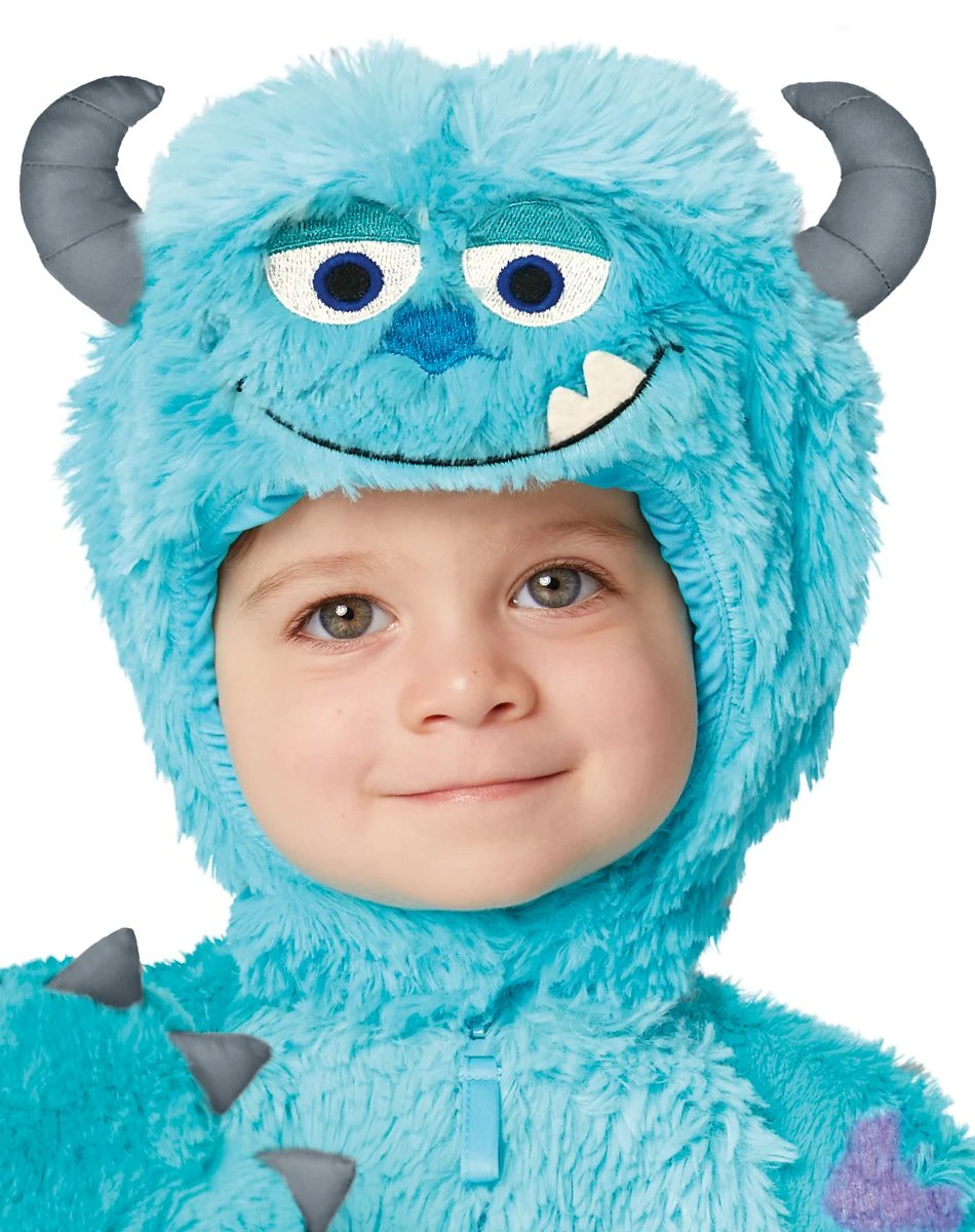 Your baby will be oh-so-cozy in this officially licensed Monsters, Inc. Sulley costume! This plush blue costume includes a long-sleeved zip-up jumpsuit with an attached tail, a smiling Sulley hood, and fuzzy gloves.