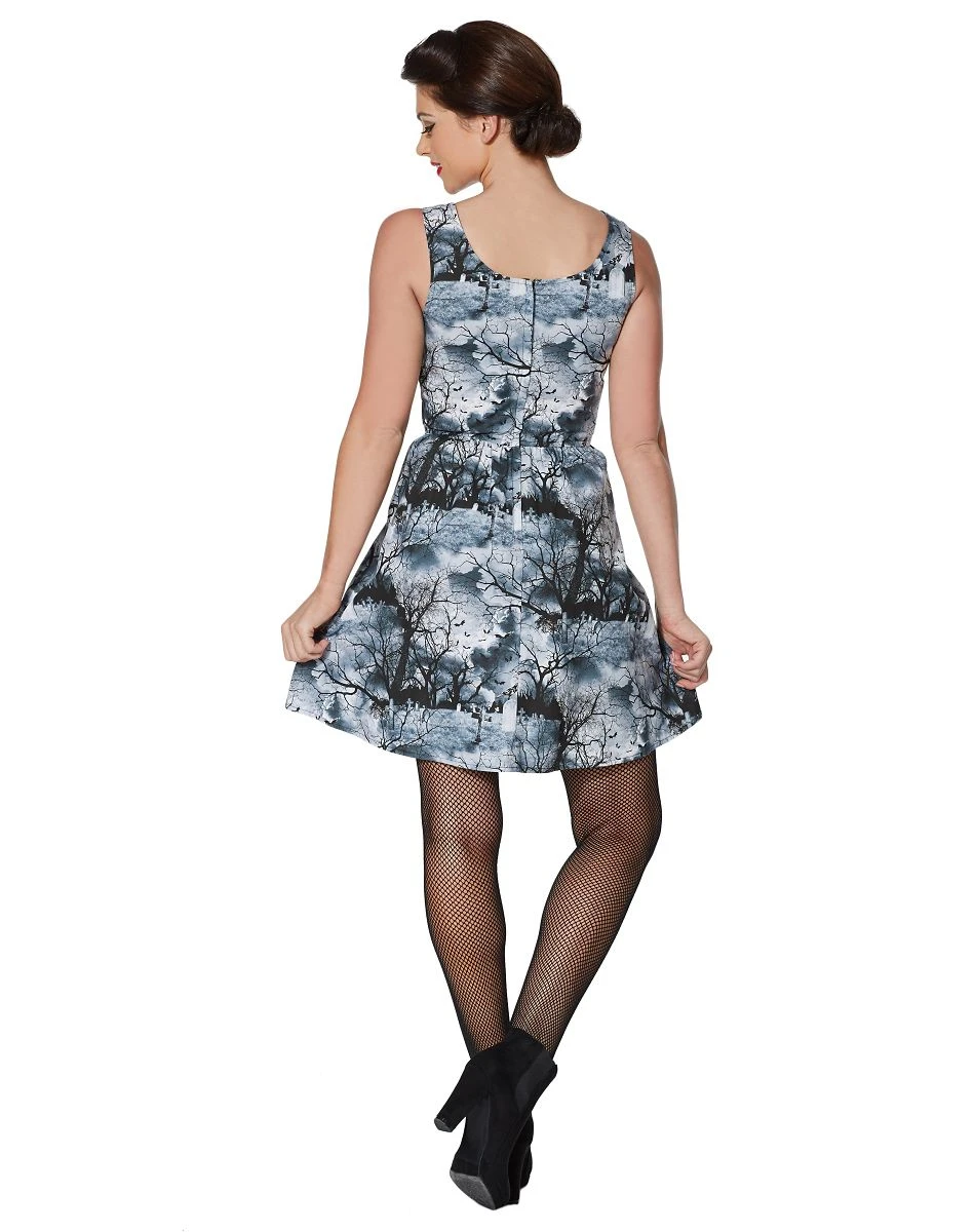 You’ll be edgy and ready for all kids of frightful fun in this cemetery dress. Whether you’re looking ghostly in a graveyard or just at your next Halloween party, this dress is sure to be a holiday hit! From the cemetery details complete with twisted trees and flapping bats, to the playful pockets, this dress is going to add some scare to your Halloween wear!