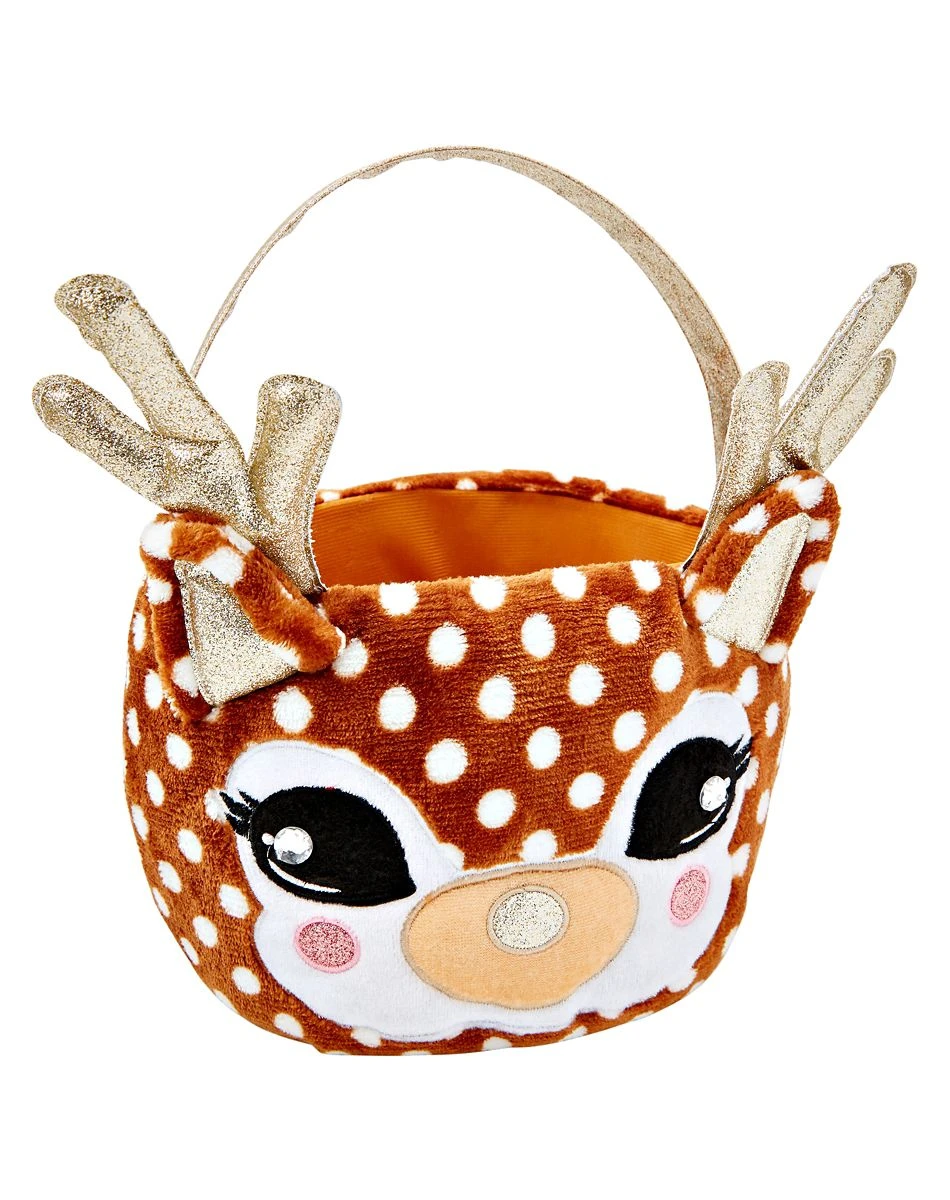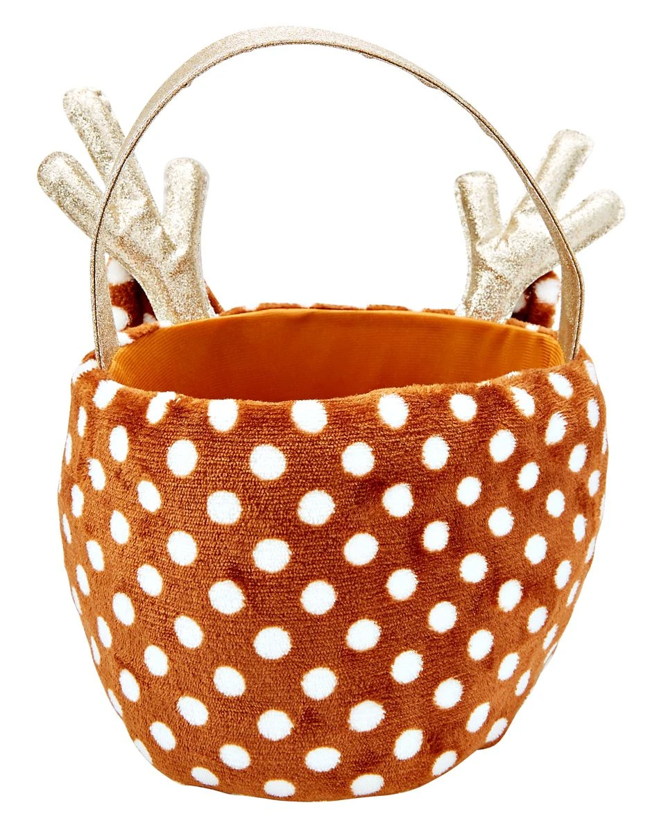 With this deer plush treat bucket you’ll have the cutest treat bucket in the forest this Halloween. This deer plush treat bucket is all brown with white polka dots and has a deer face and antlers on the front. The deer also has plastic gems as eyes and sparkly pink rosy cheeks. If you’re looking to become closer with nature this Halloween and love animals, than this is the best treat bucket around.