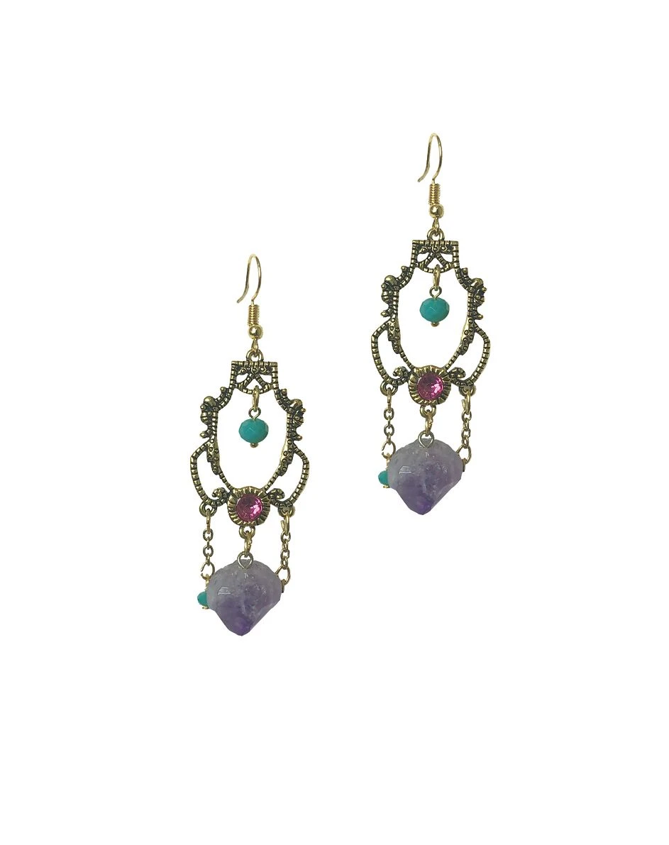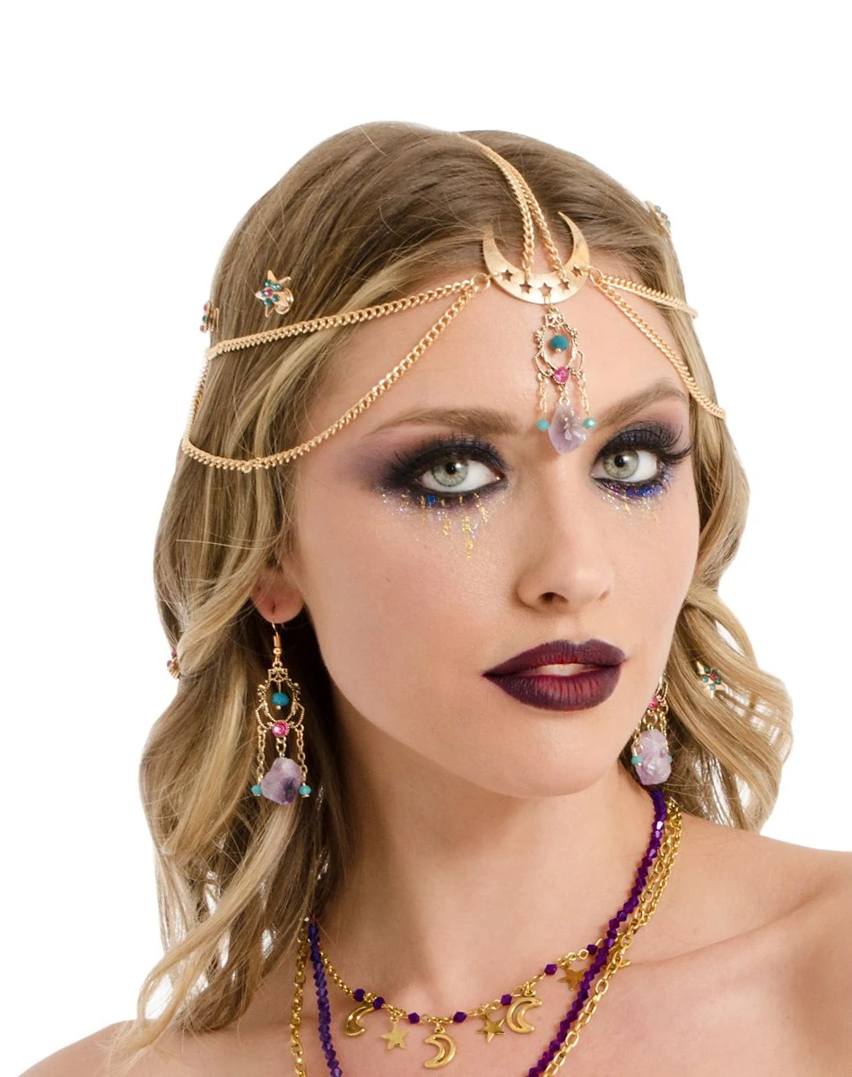 Complete your costume with a pair of these fortune teller dangle earrings! With a golden appearance and adorned with brightly colored jewels, these elegant earrings are the perfect addition to any mysterious getup.
