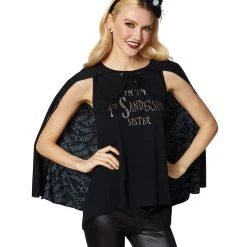 You can be a witch too with this officially licensed caped t-shirt from Disney’s Hocus Pocus! With this black tee emblazoned with silver lettering, plus attached cape riddled with the word “amuck,” you can join the villainous trio of sisters and use your magical powers for evil, too! This shirt is available exclusively at Spirit Halloween, so grab one while you can and join this frightening family of witches!