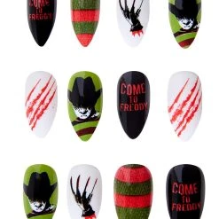 Show off your favorite horror movie with these official A Nightmare on Elm Street Freddy Krueger press on nails! These faux nails feature Freddy Krueger as well as his familiar colors. They’re perfect to go with your horror costume (sold separately) or just to add some fun to your fingertips.
