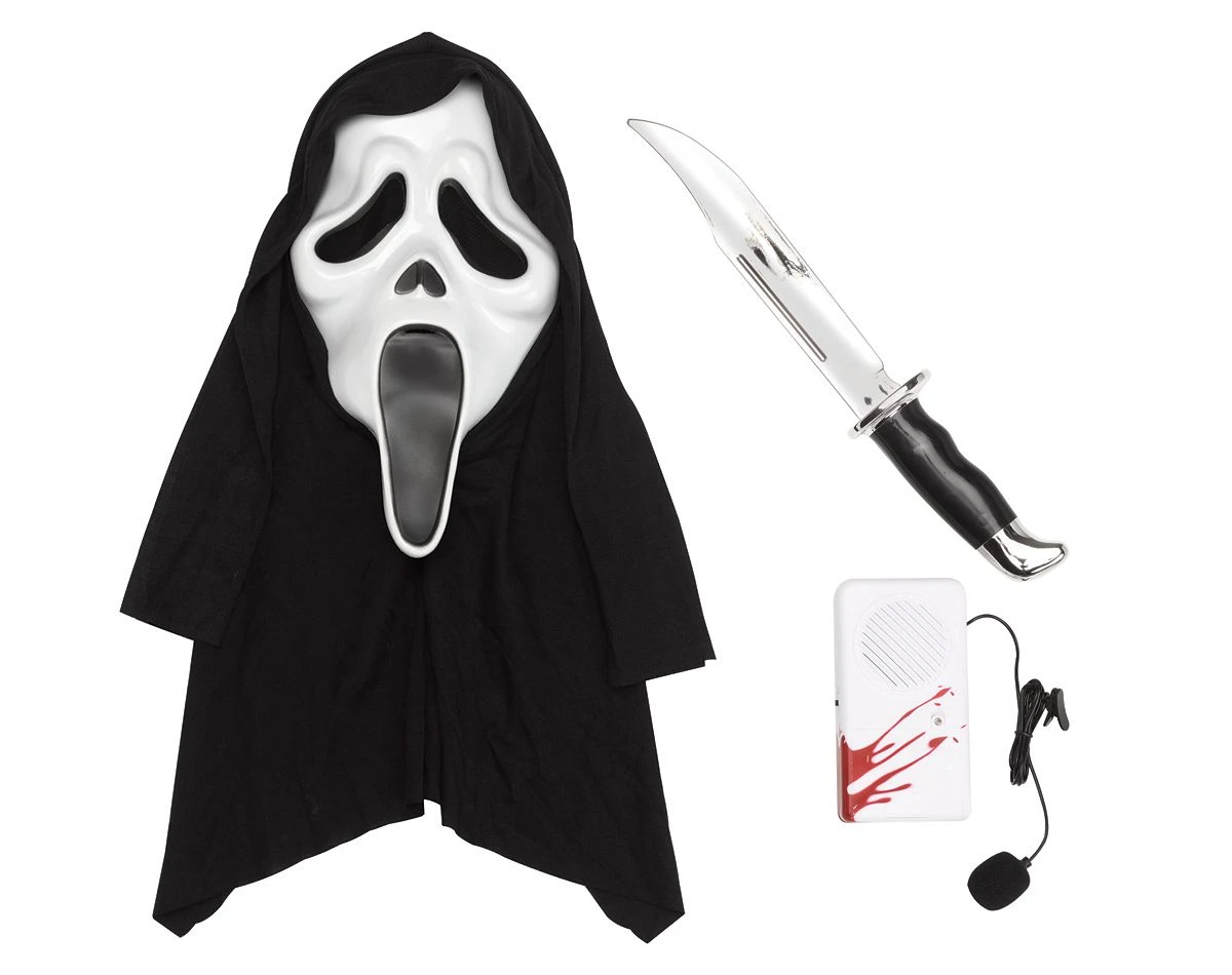 Become a legendary horror villain this Halloween when you get this officially licensed Ghost Face ® costume kit. Featuring Ghost Face’s ® signature mask, a prop weapon, and a voice changer that clips onto your clothes, you can bring the iconic killer to life. Get ready to spread fear!