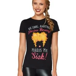 Ah, another glorious morning…how awful! Share your distaste of mornings with Winifred Sanderson when you rock this awesome Hocus Pocus t shirt! This wickedly cool top features her signature wild orange hair, and one of her famous quotes that reads, “Ah, another glorious morning! Makes me Sick!” in pink and white letters.