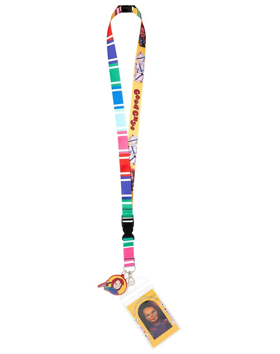 Your favorite killer doll wants to be your friend and help you carry your ID with this Good Guys Chucky lanyard. This fun lanyard features a colorful strap with Chucky’s face on it and includes a collectible sticker.
