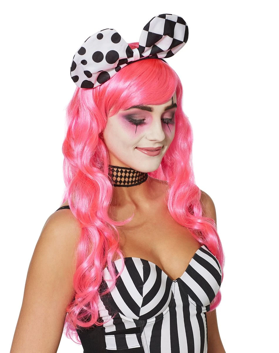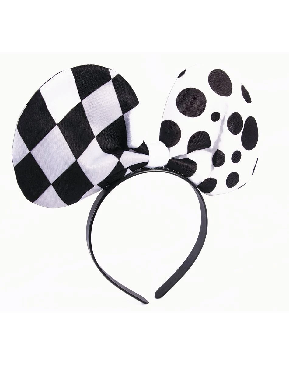 Complete your fun harlequin costume with this this giant black and white bow! This large bow features polka dots on one side of the bow and a diamond pattern on the other side, making it perfect for any cute and sweet clown or harlequin costume!