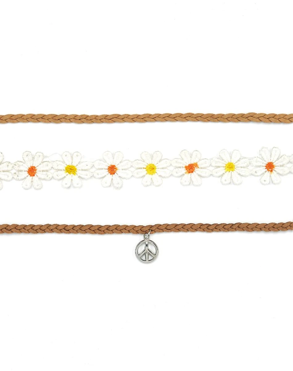 Get ready to embrace a hippie style with this Daisy Fabric Choker Set! The set includes three chokers: a navy braided one, a thing tan braided one, and one make up of white daises with a silver peace sign hanging off it! Go back to the 70’s and let everyone know that you love nature and peace with these necklaces!