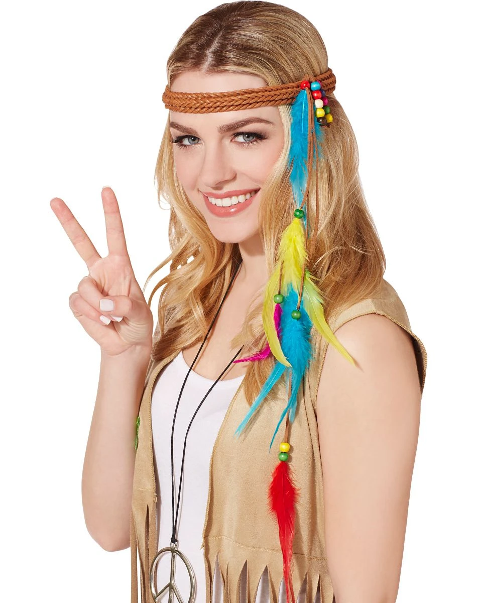 Complete your 70’s hippie costume (sold separately) with this Hippie Faux Feather Headband! Show everyone you are into nature and peace with this braided brown headband with hanging colorful faux feathers and beads.