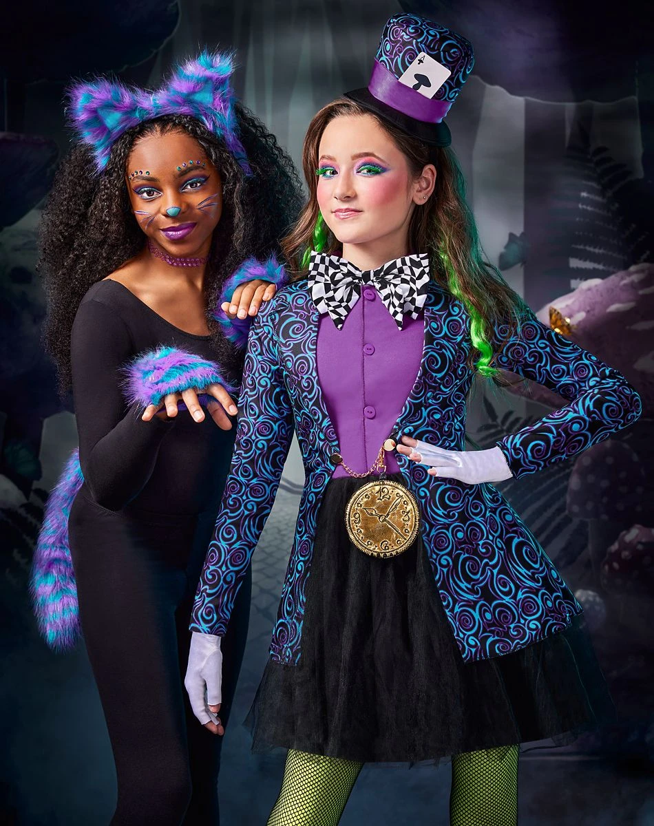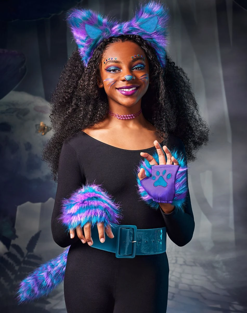 Meow! Add some colorful fun to Halloween night with this Kids Alice Striped Cat Costume Kit! This bright blue and purple kit, which includes a headband, a tail, and gloves, is sure to keep you warm and cozy all night long.