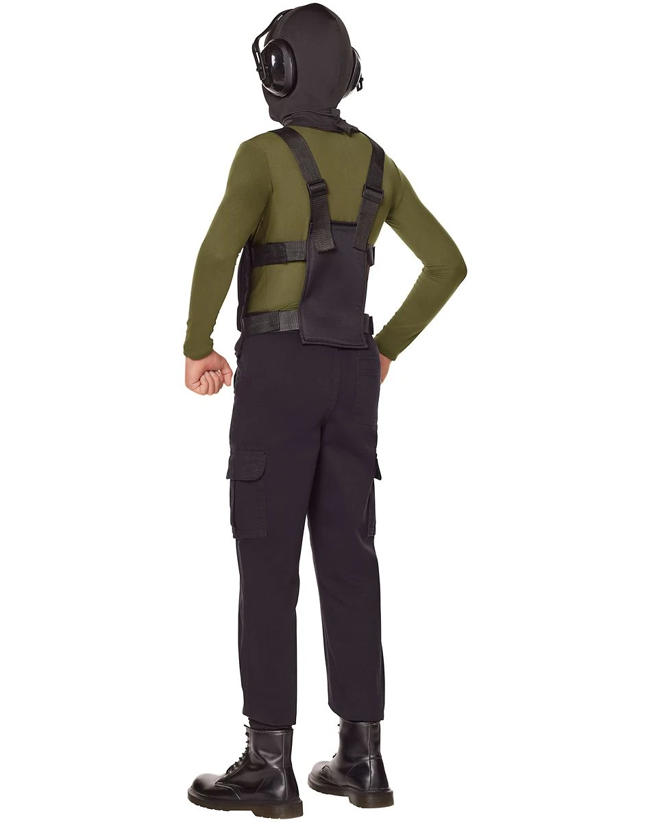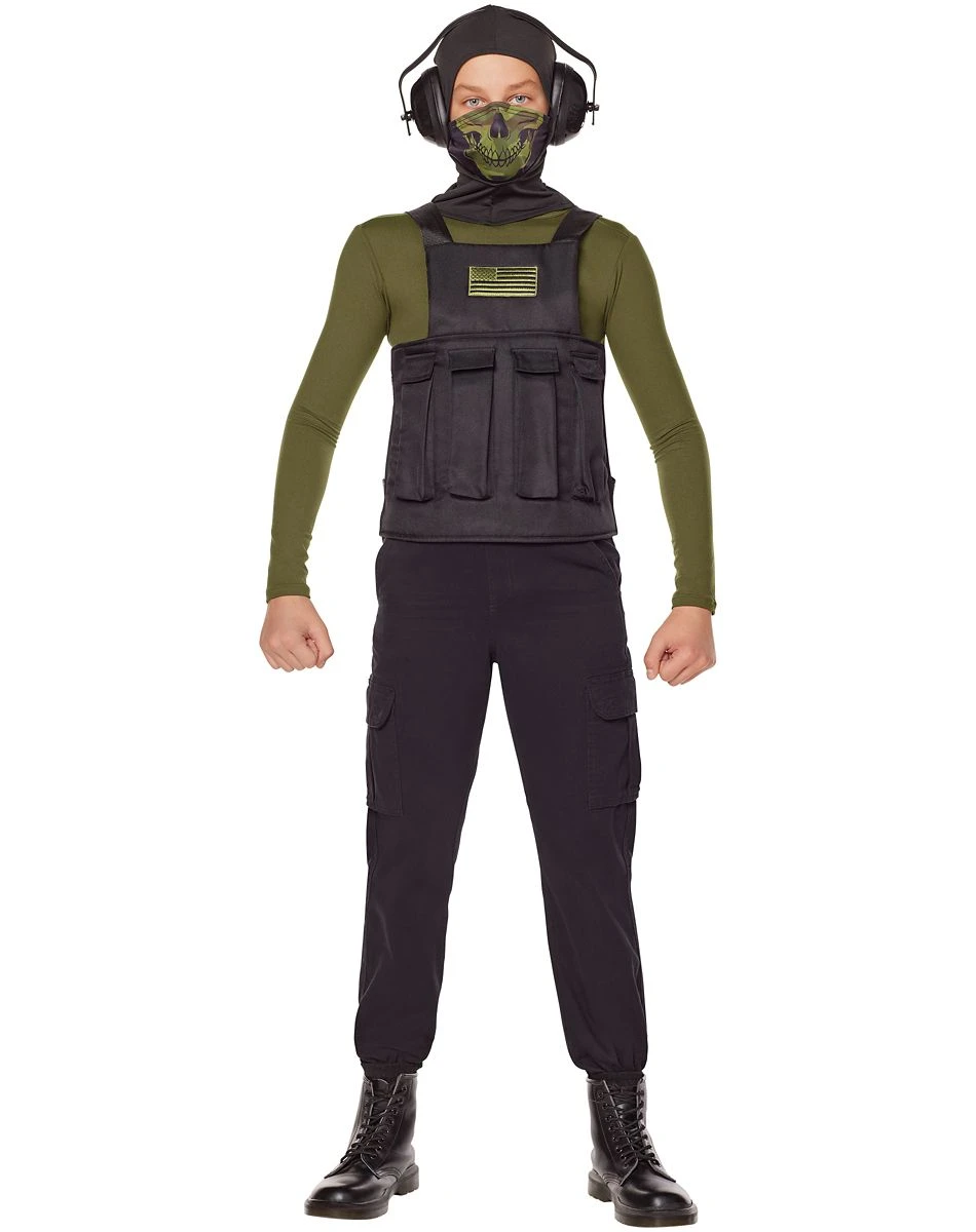 Become the ultimate army soldier when you wear the army costume kit! Featuring a vest, hood, headphones, and a skeleton mouth cover mask, this costume will have you prepared for any adventures that Halloween brings.