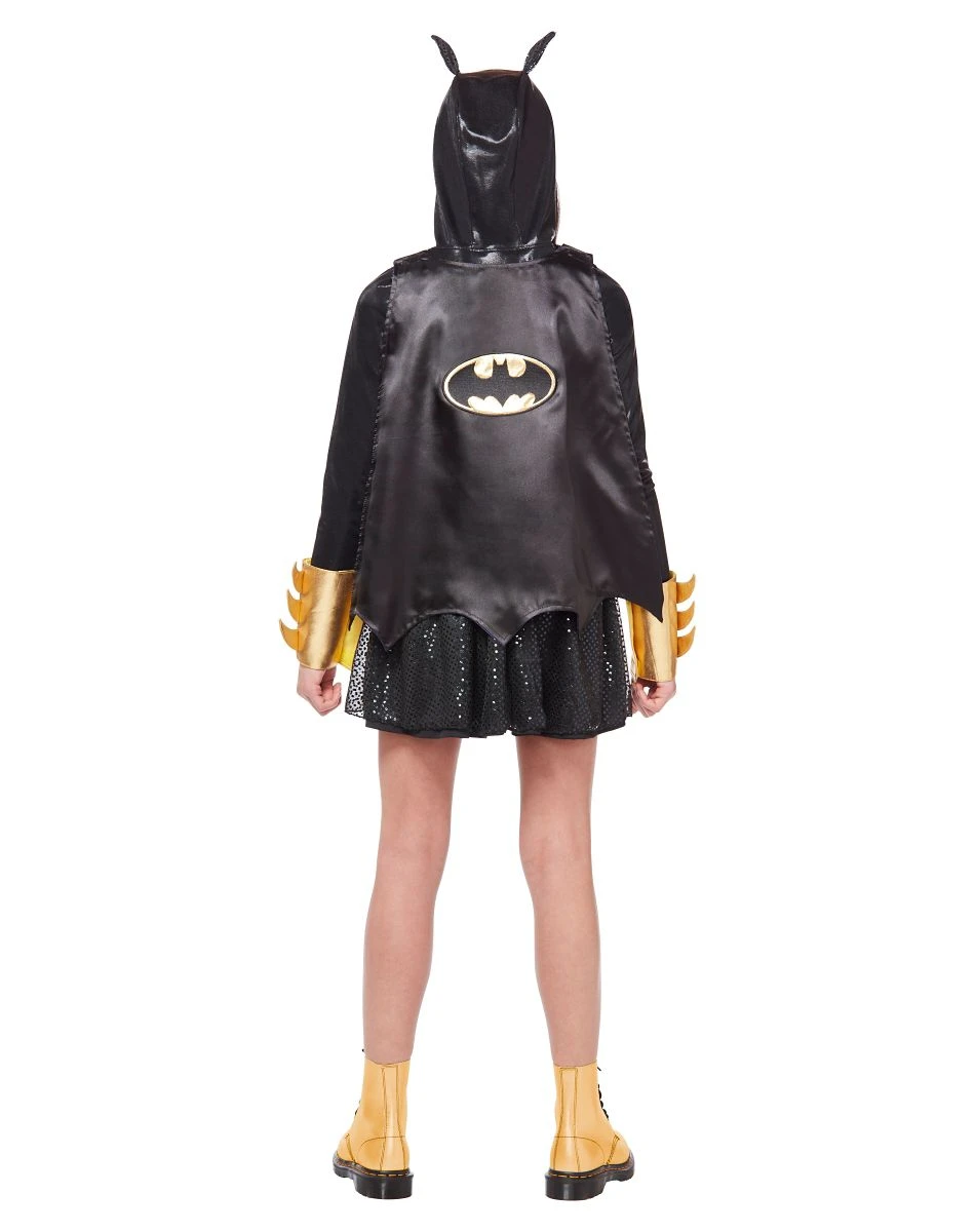 Your little girl will love traveling house to house collecting only the best candy in this Batgirl costume. Long sleeved dress features a metallic Batgirl logo that will have your little one shining all night long. Attached hood features sequined ears that match the sequined skirt perfectly. detachable cape has a purple lining that will add a splash of color to the outfit. Add the included arm band, belt, and glitter mask for the ultimate Batgirl look.