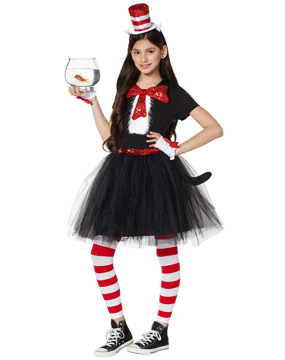 Let your little one travel from house-to-house, informing everyone what Halloween is about! Let her teach them how to read, how to collect candy, and all sorts of things in this Kids Cat in the Hat Dress Costume! This adorable dress is the perfect way, to let your little girl have fun throughout the day! The tulle skirt and the sequins that shine, are all important, they are such a good time! Complete the look with the matching tights, the headband, and the gloves that fit just right!