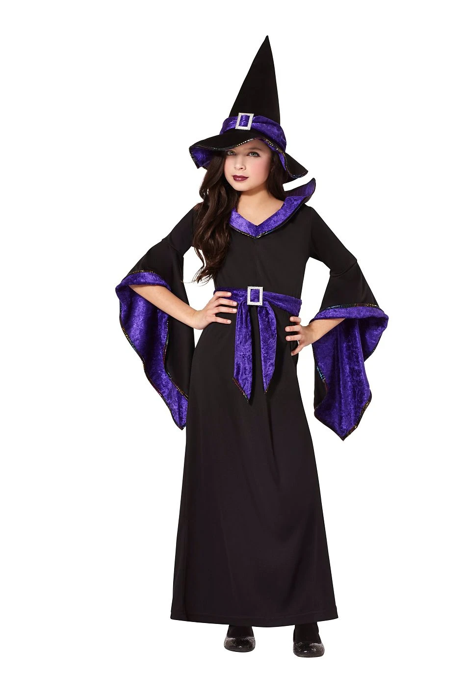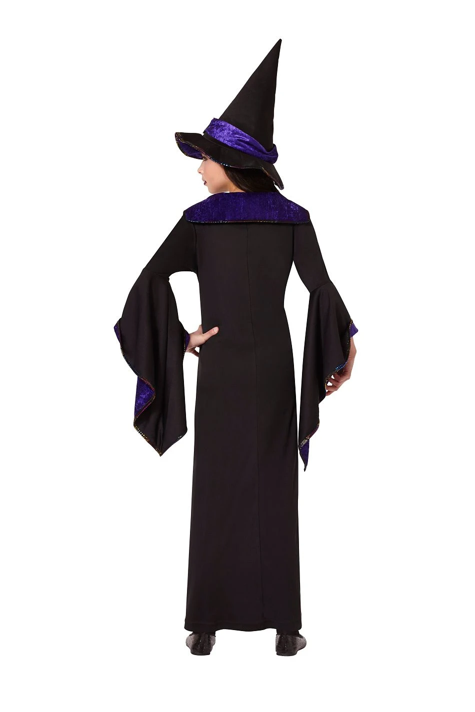 Make your magic mark this Halloween in this bewitching costume! Be the most stylish spell-caster on the block with this look which includes a beautiful black dress with a velvety purple belt and collar and, of course, a cute witch hat. Broomstick not included!