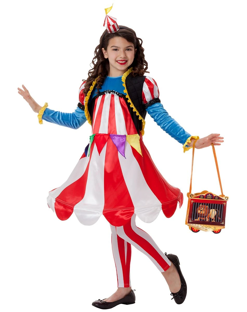 From Our Exclusive Signature Collection. Why choose between being a clown or a ringmaster when your little one can become the whole circus! This adorable circus costume features a big top skirt, colorful flags at the waist, and adorable striped accessories that will have any young circus fan ready to put on a show. The cute lion wagon also doubles as a purse!