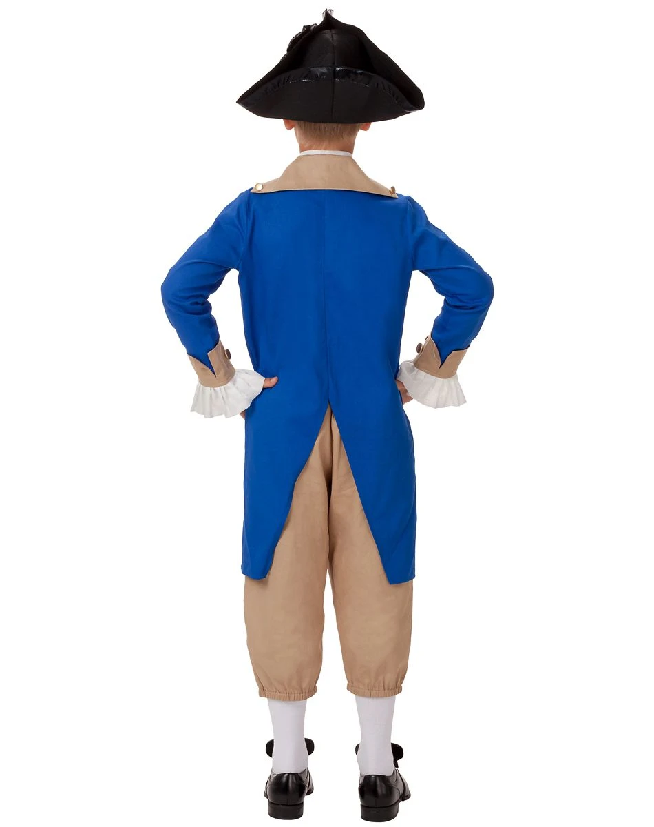 Have your child travel back in time in style when they were this deluxe Colonial costume! Your child will look as though they’ve jumped right out of the Revolution with these tan pants and top, along with the attached blue jacket. So whether they’re trick or treating or performing in a play, your little one is sure to steal the show wherever they go!