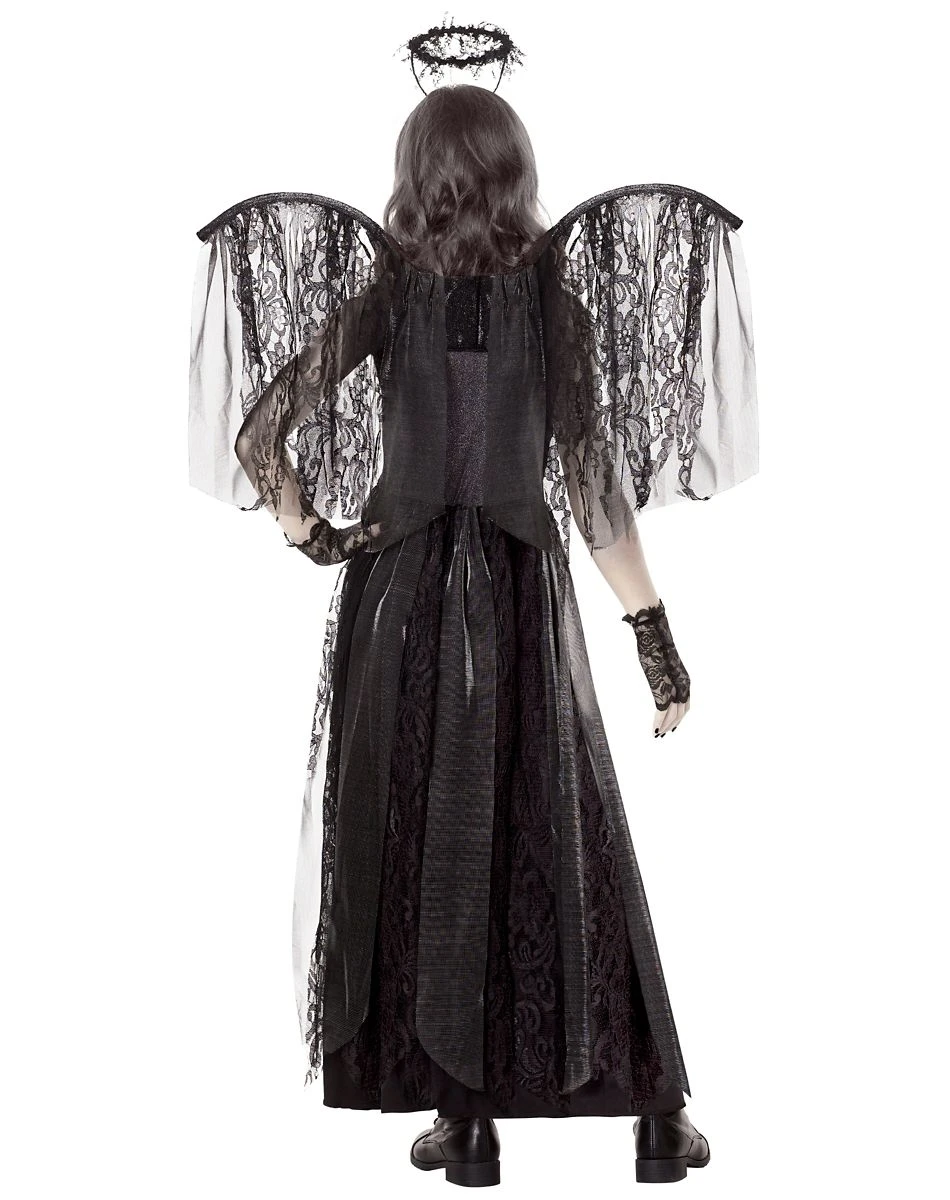 Float through the night air in this shadowy and beautiful Kids Dark Angel Costume! This long, dark, lace-detailed dress pairs angelically well with falling lace wings and delicate lace fingerless gloves. Complete the elegant look with a black halo headband.