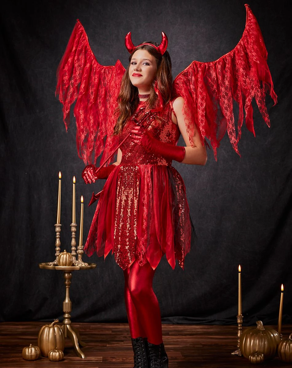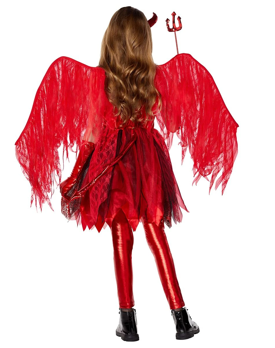 Feeling devious this Halloween? You sure will be not long after getting all dressed up in this Kids Devil Costume. There’s no doubt you’ll have one of the hottest costumes of this Halloween with this outfit that features a red dress with sequin and lace details, metallic leggings, a pair of lace shreddy wings, gloves, a tail, a sequin pitchfork, and of course a headband featuring devil horns. Show everyone how the devil gets down on Halloween with this amazing costume from our signature collection!