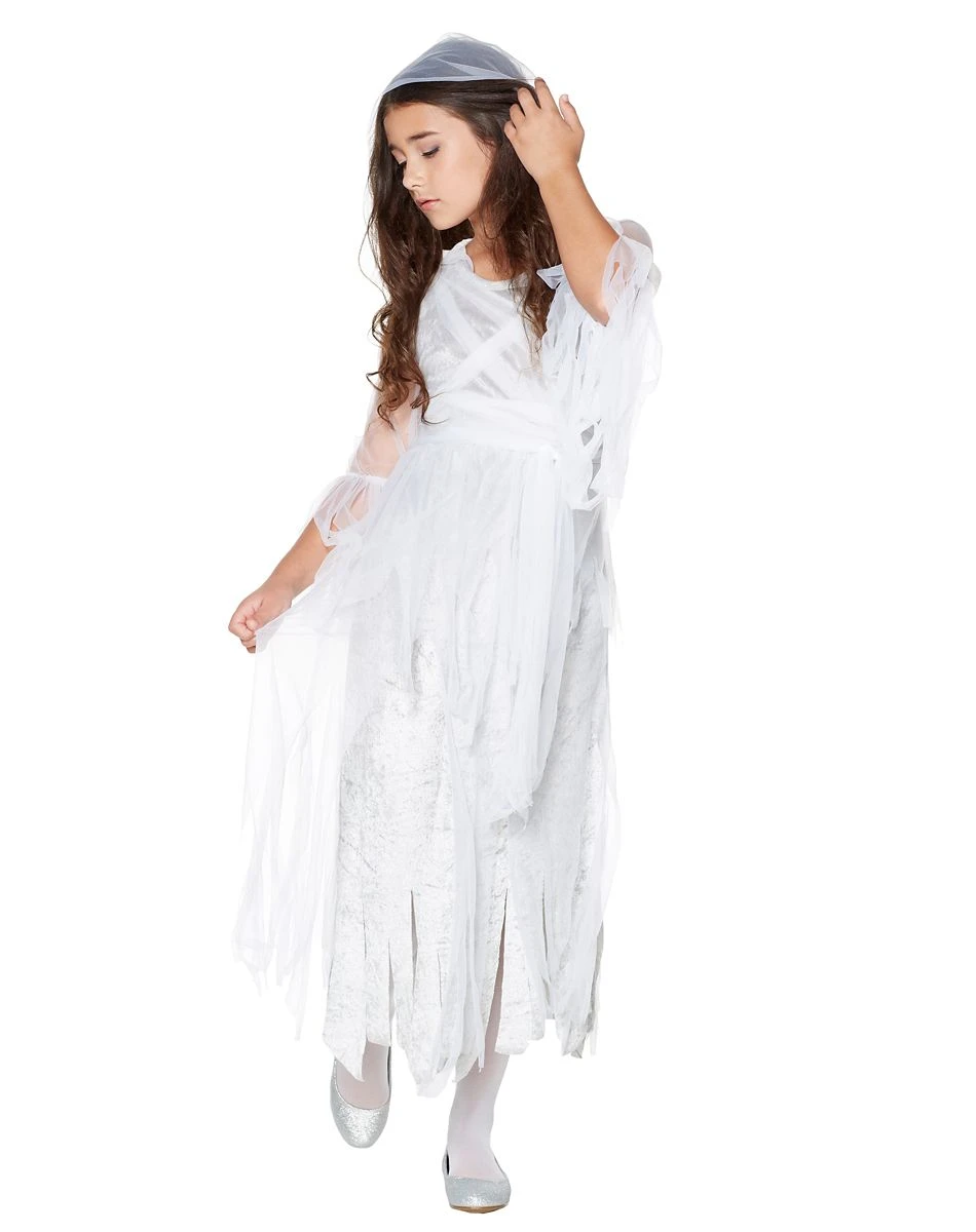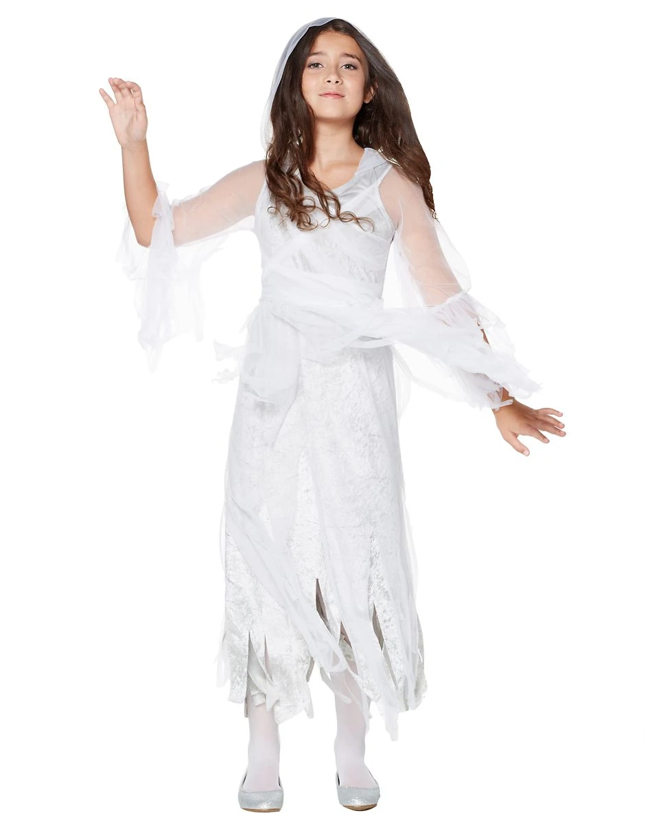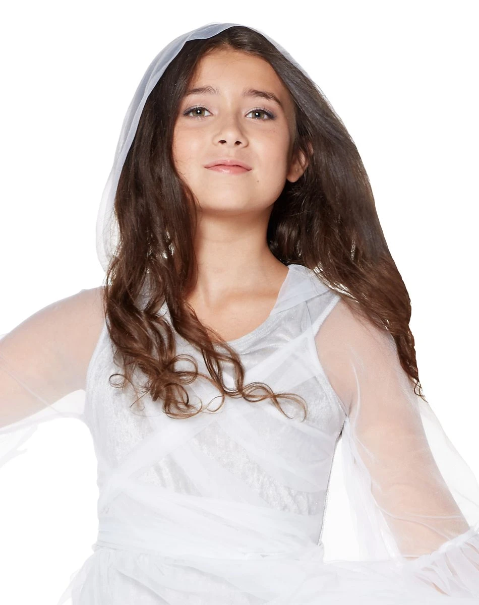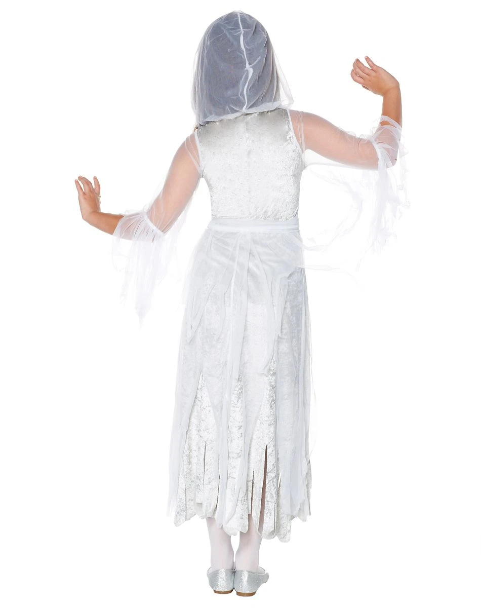 Your child will be excited to haunt the halls of any forgotten building as this gorgeous Haunting Beauty! The full length, all-white dress features a purposely shredded design to make it look as though your little one is floating against the air, while the attached hood and sash give a wonderful finishing touch to any already haunting costume.