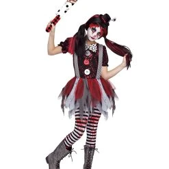 They’ll be lucky to leave the carnival alive when you’re in this Killer Clown Girl’s Costume! Look killer and cute in this dress with a unique red and black pattern top featuring big center buttons and a bow tie. The dress also has suspenders attached to a shredded red and gray tutu skirt, as well as striped tights with your latest victim’s blood. Top the look off with the included hat with flower and your weapon of choice (sold separately) for a perfect mischievous night!