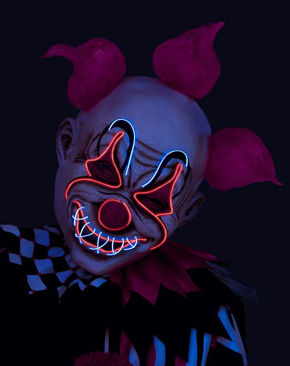 Welcome to the twisted circus! This clown costume will have everyone shaking in their seats, anticipating what your next act will be. The striped jumpsuit features large pom pom detail that will have you standing out among the rest. Add the included collar and the light-up mask and get ready to scare everyone in the neighborhood this Halloween!