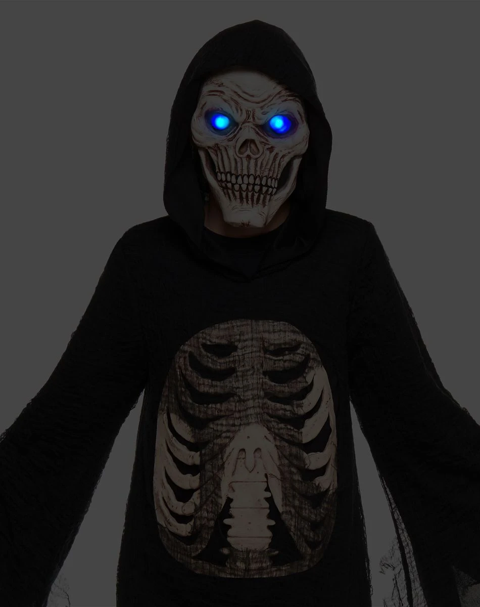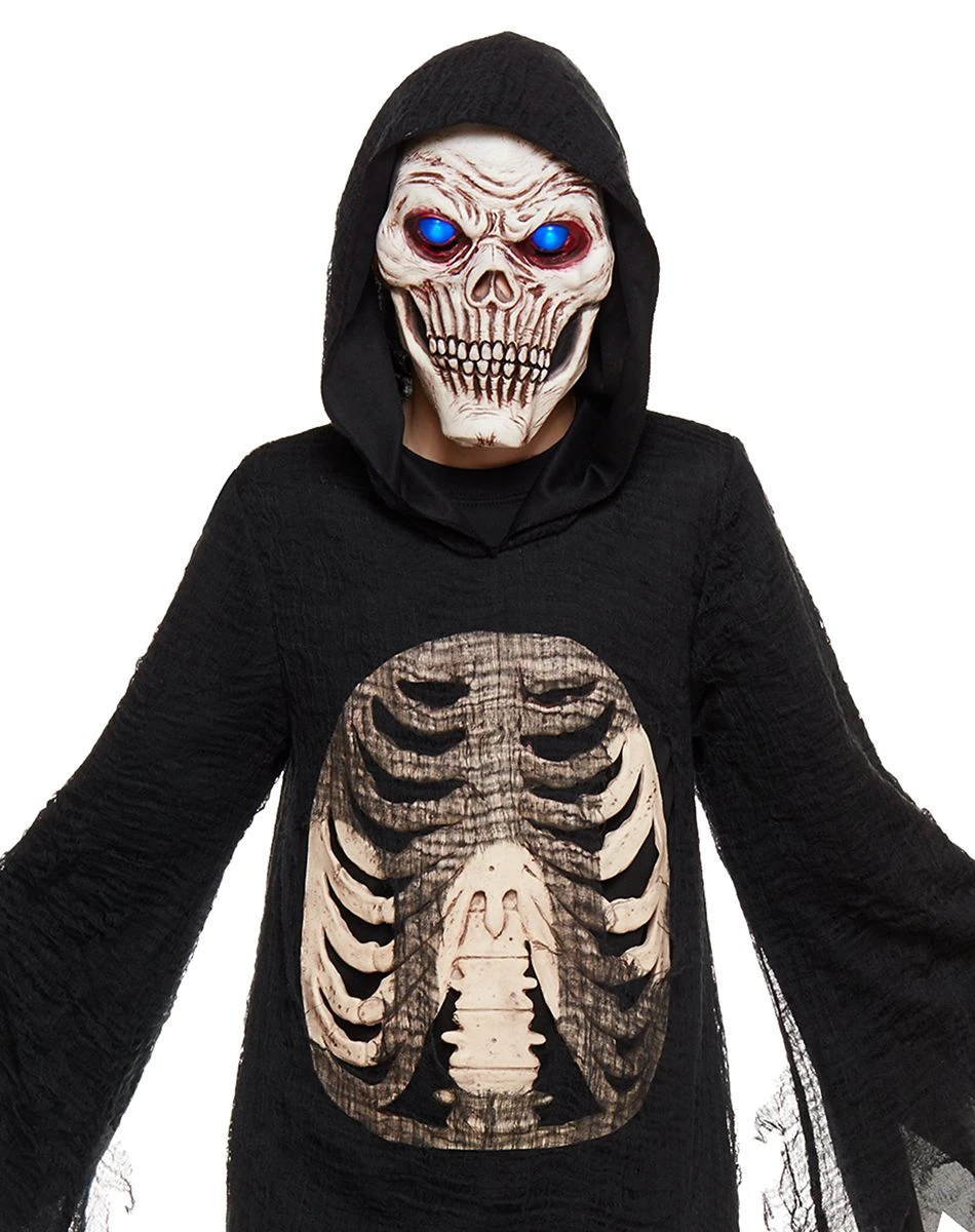 Haunt the night wherever you may go when you dress up in this kids Reaper costume. The long, black robe is tattered and features a rib cage in the center of the chest to create a skeletal effect–and the light-up mask is sure to make you stand out in the darkness!