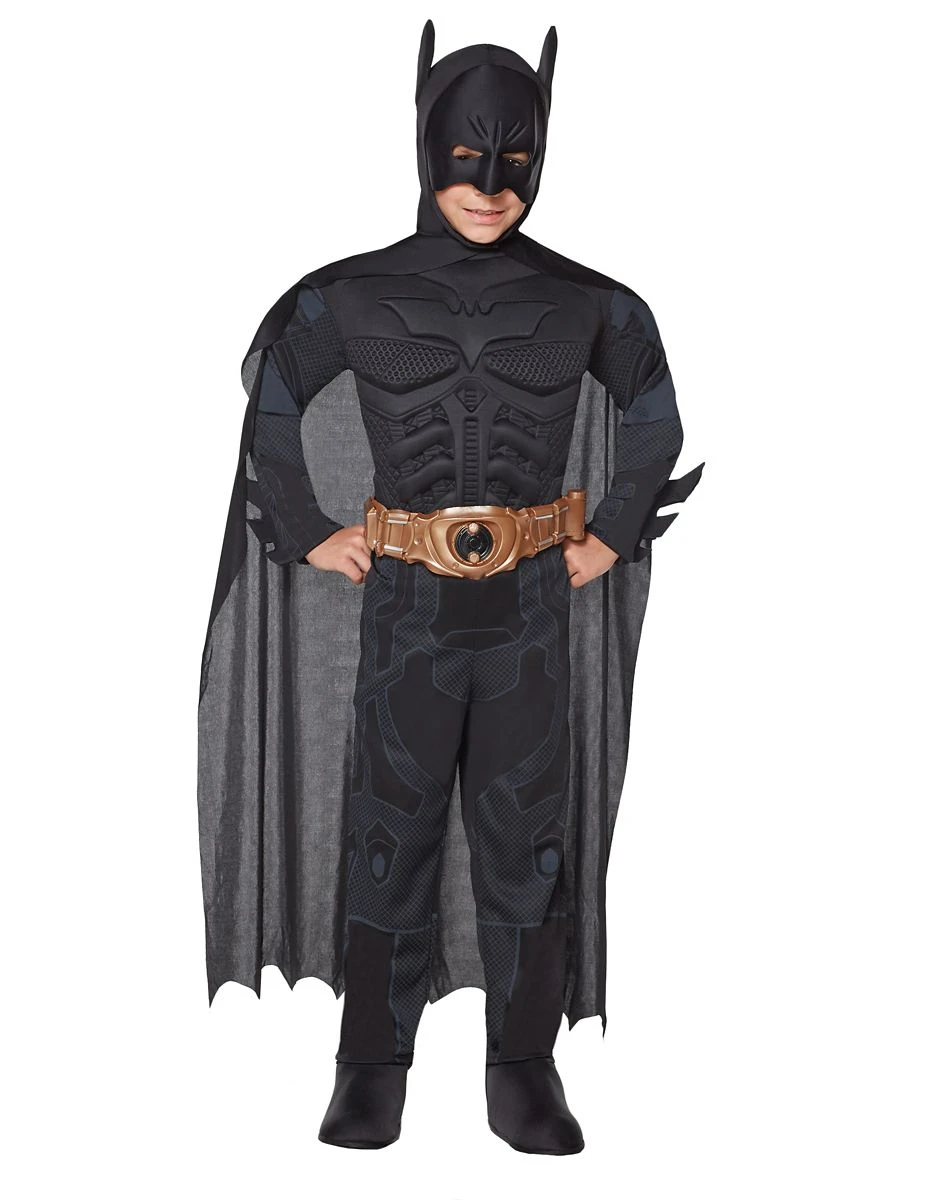 Protect Gotham City when you wear this officially licensed Batman The Dark Knight muscle chest child costume. The black, highly detailed screen printed jumpsuit of this Batman costume comes complete with gauntlet arms and attached boot tops along with character headpiece and cape.