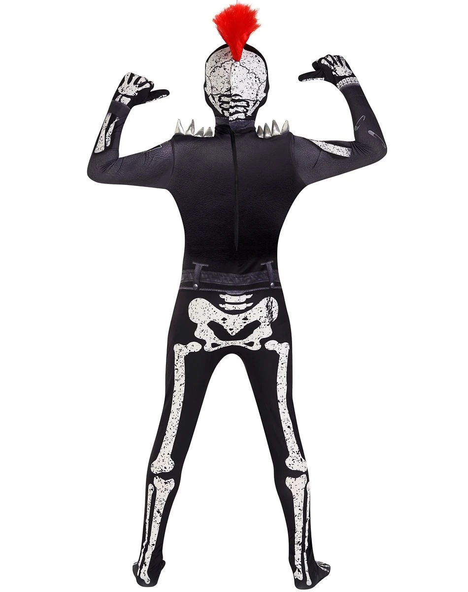 Rock on this Halloween in skeletal style with this Punk Skeleton Skinsuit. With this skinsuit on everyone will know you like to party hard and you’ll be looking like a skeleton stud! This skin suit features a skeleton pattern on it with an attached red mohawk wig that’s sure to have you looking ready to rock!
