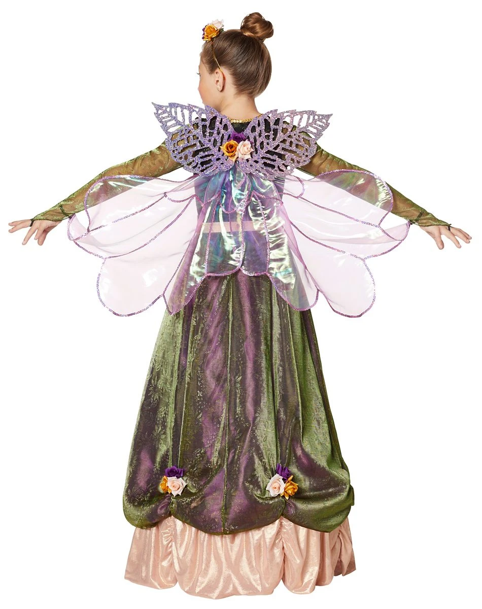 From Our Exclusive Signature Collection. Let your little one dance through the forest in this adorable woodland fairy costume! The long purple dress features a green mesh overlay that will give her the perfect amount of earth-tones. Flower detail will have her looking like a garden princess instantly. Add the removable hoop skirt slip for more volume. Accessorize this fairy look with the included glitter wings, sequin belt, and floral headband! You and your little girl will be in for the best Halloween to date!
