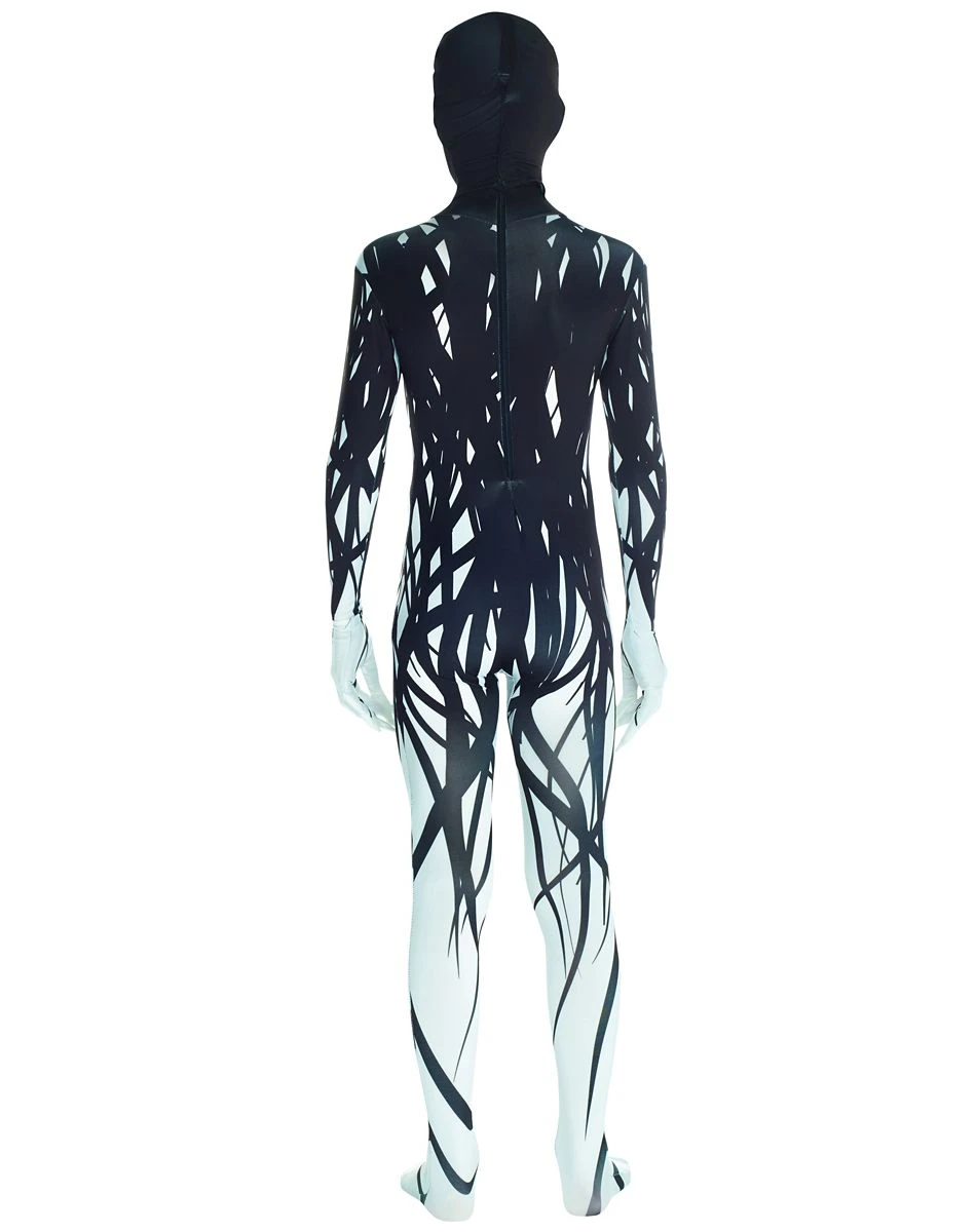 Summon chaos this year when you wear this Zalgo Skin Suit Child Costume! This skin suit features a black face mask with red and white circles for eyes which ribbons down, creating a tangled black effect that fades to a white bottom. Wear this costume and no order is sure to exist this Halloween.
