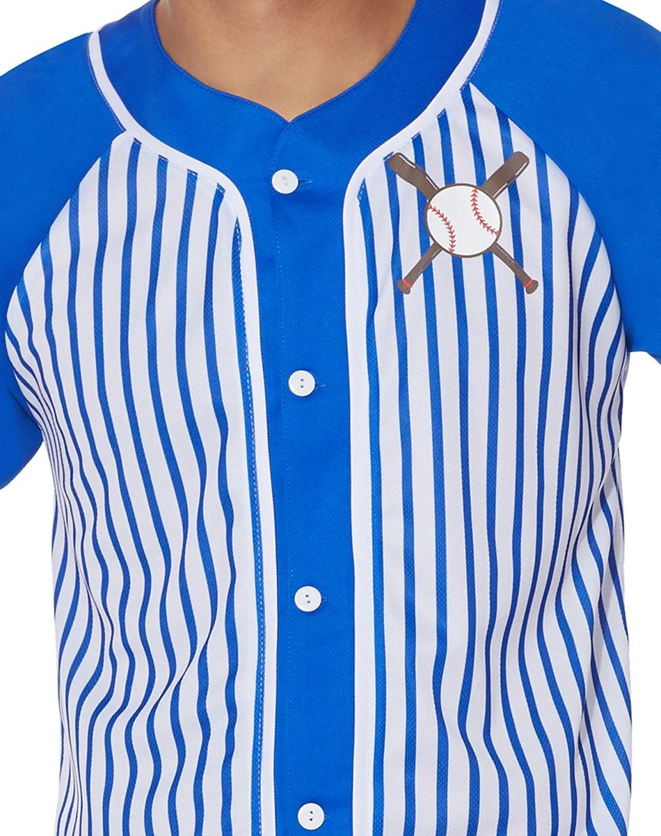 Batter up! Show off your team spirit and your love for baseball when you slip into this stylish blue and white baseball jersey this Halloween! Make the old ball game come to life!