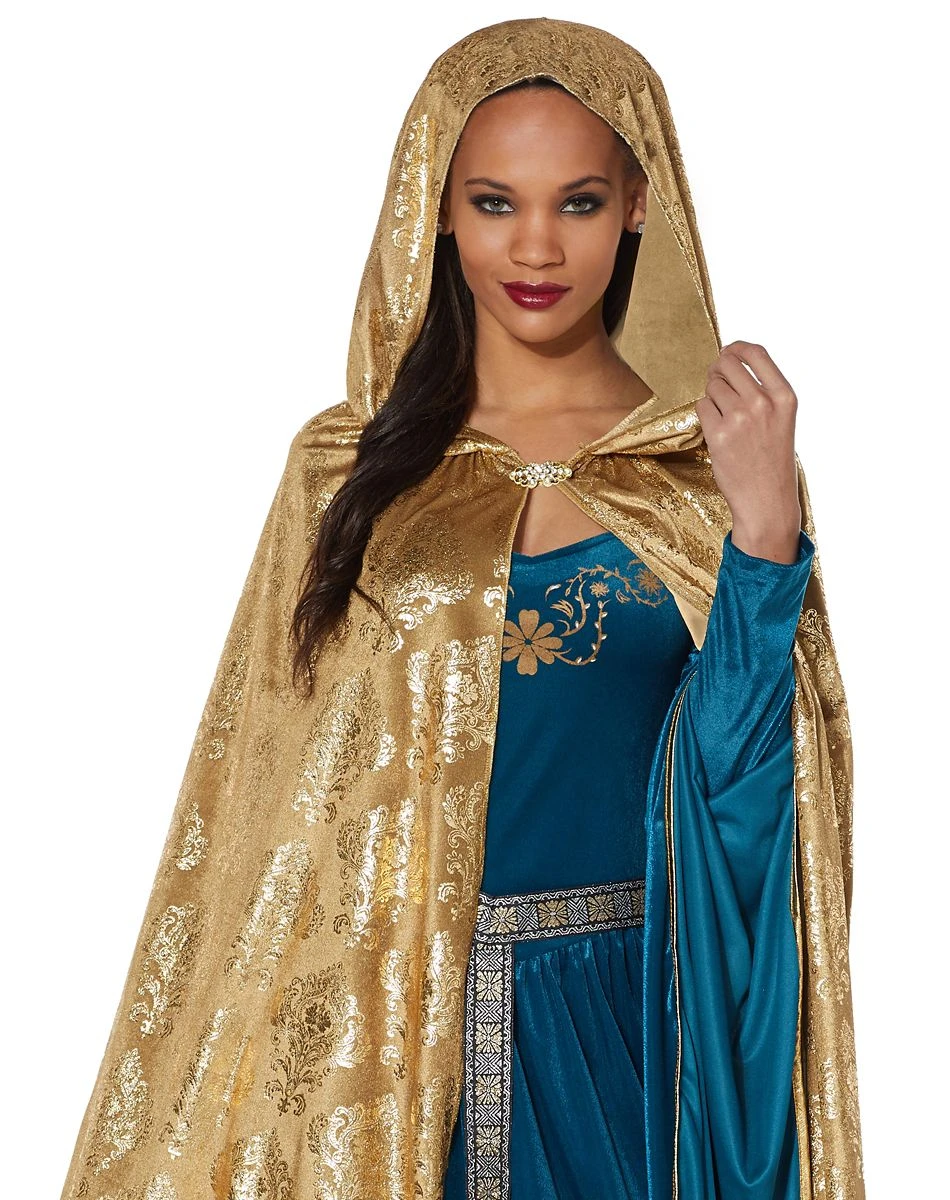 Go back in time and show off your royalty when you wear this stylish medieval cape. The velvet material and goldtone foil accents will have you shining all day long. Display the beautiful rhinestone broach and you’ll instantly be living in medieval times!