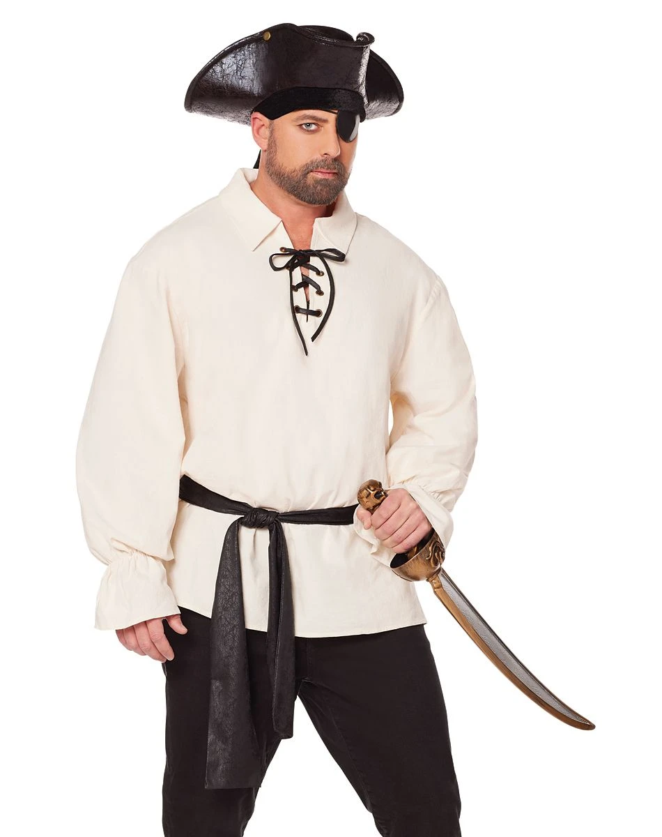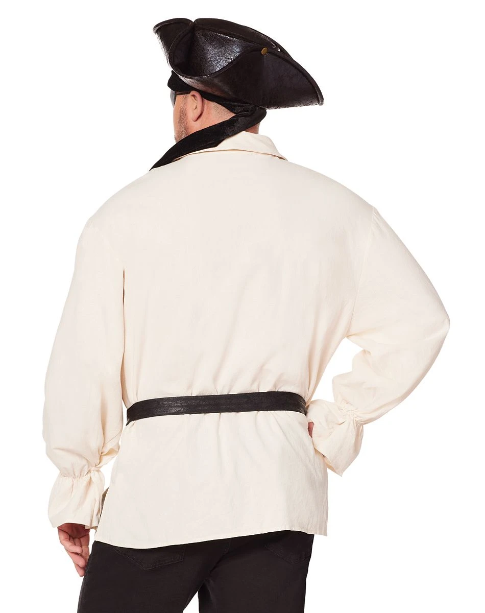 Look and feel like a mischievous pirate in this flowing shirt! This crisp pirate shirt features a lace-up collar, gathered cuffs, and a long, draping waist belt.